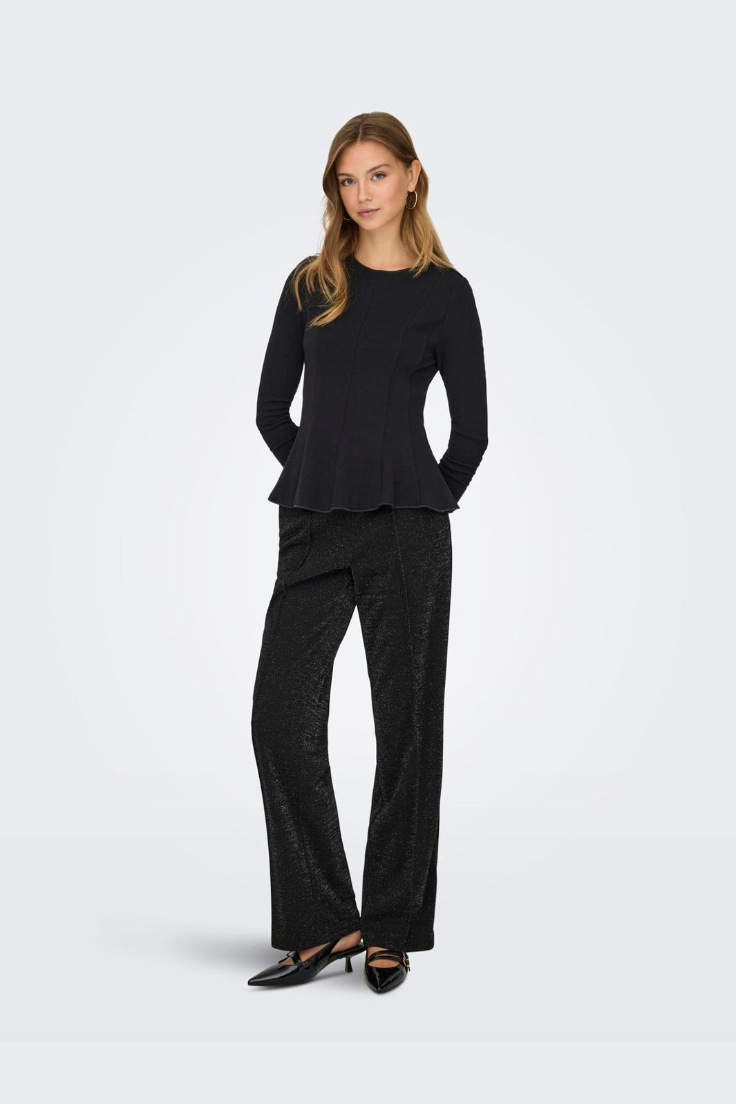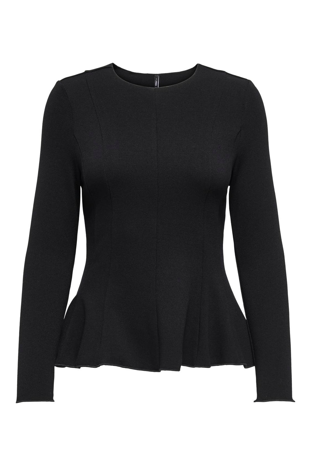 Schwarzes Peplum-Top von Only mit Rundhalsausschnitt und langen Ärmeln. Das Top hat dekorative Nähte und Rüschen, die ihm einen femininen Ausdruck verleihen.