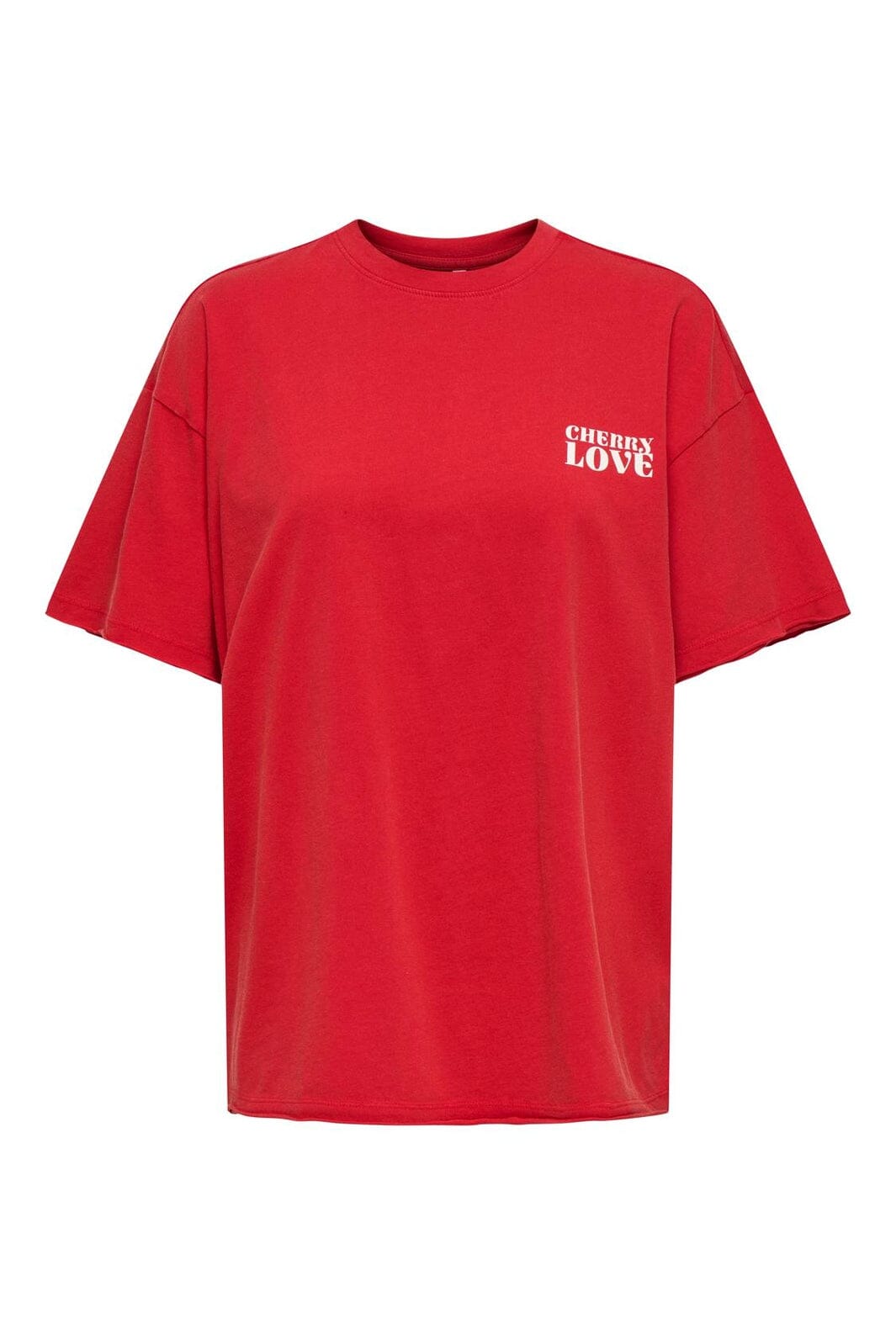 Rotes, oversized T-Shirt von Only aus 100 % Bio-Baumwolle. Das T-Shirt hat einen Kirschprint und Schrift auf der Brust und am Rücken.