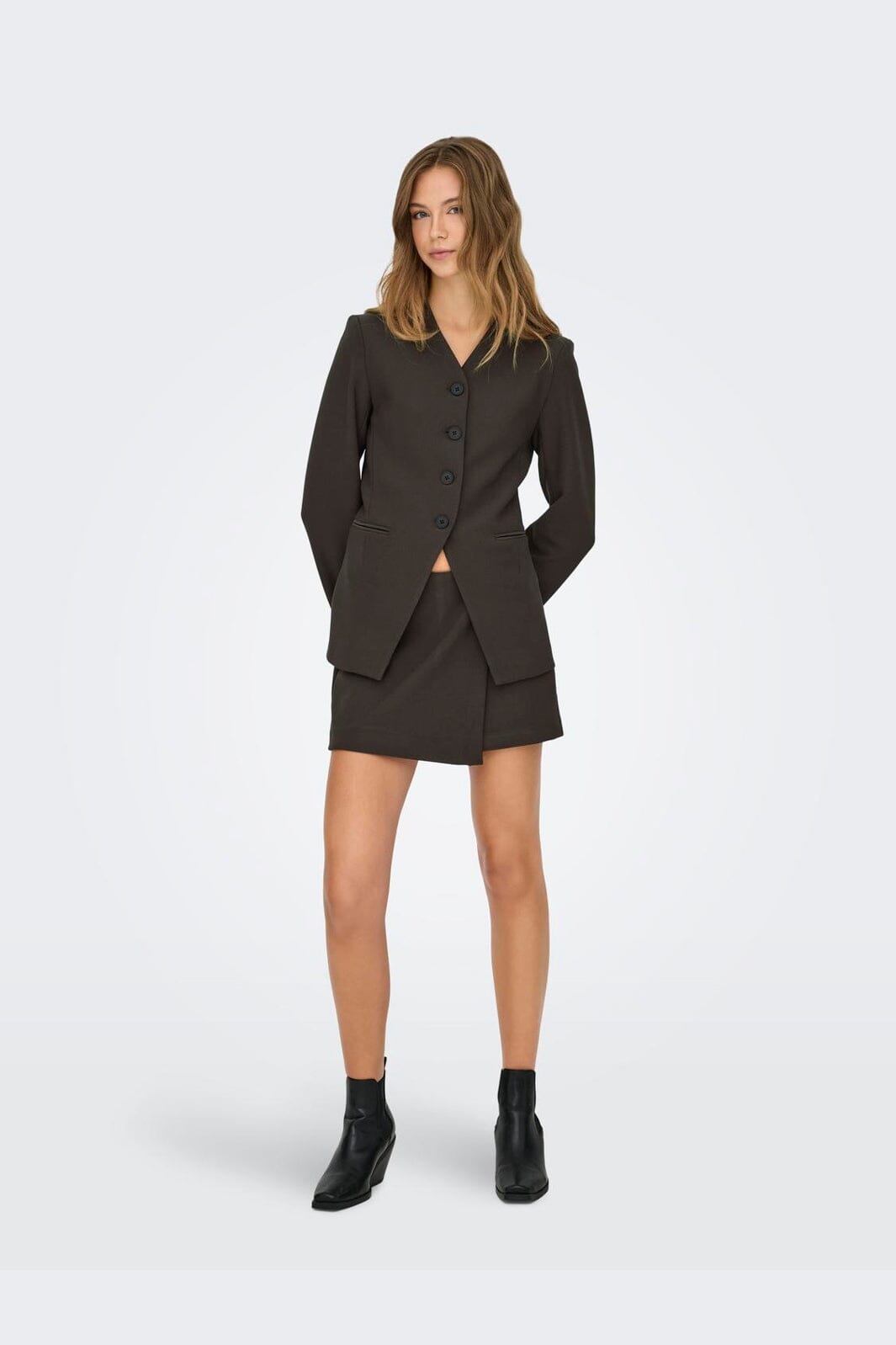 Dunkelbrauner Skort von Only mit asymmetrischer Überlappung vorne. Der Skort hat eine mittelhohe Taille und eine oberschenkellange Passform.