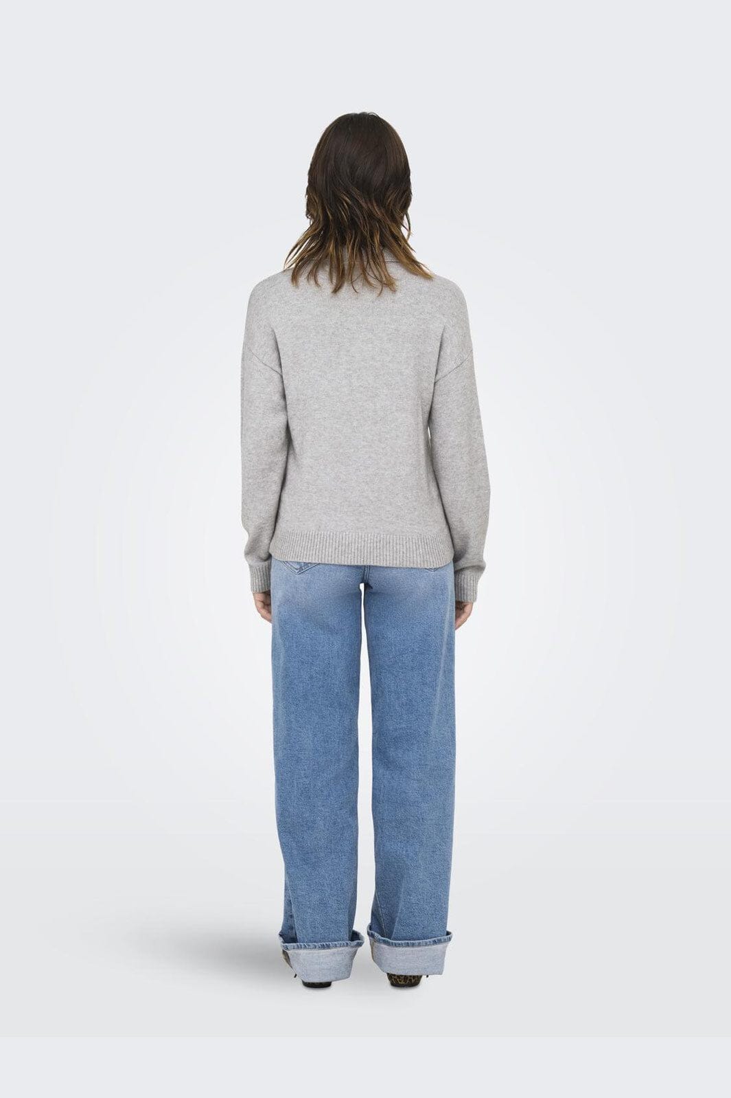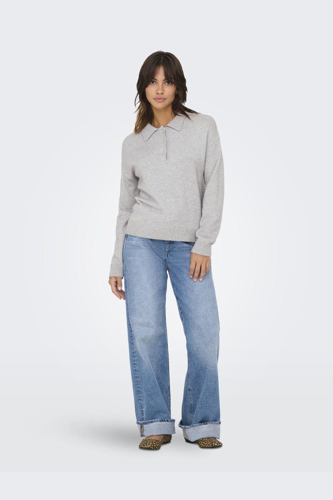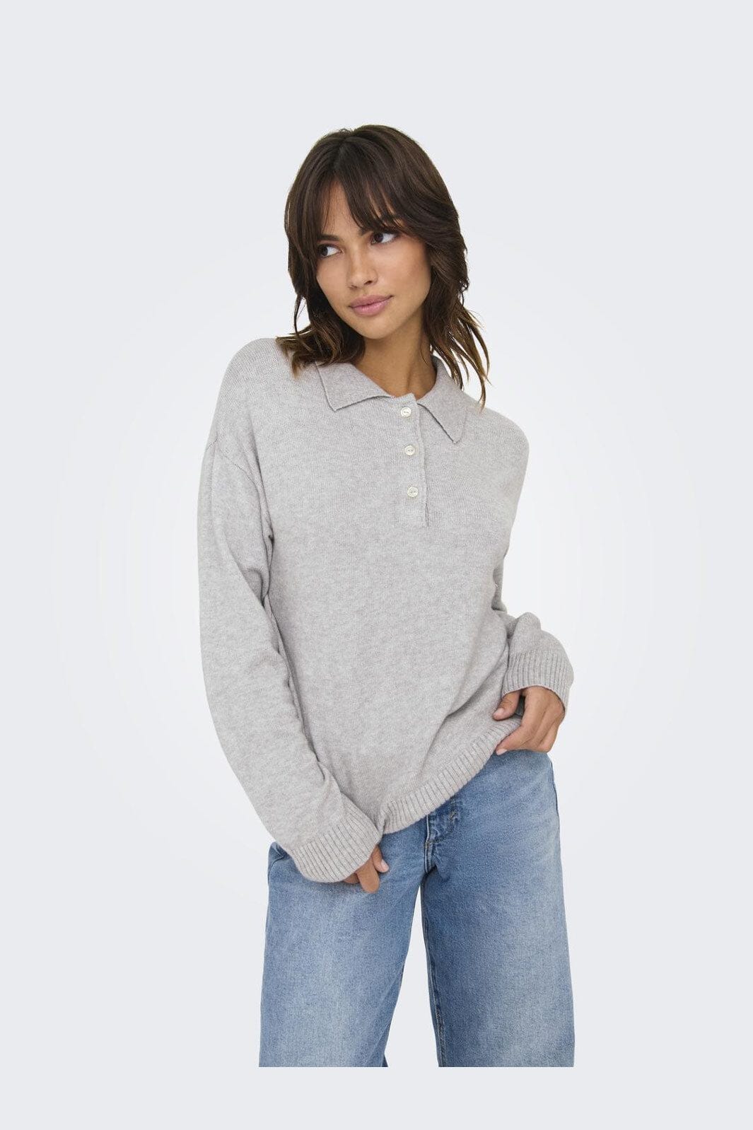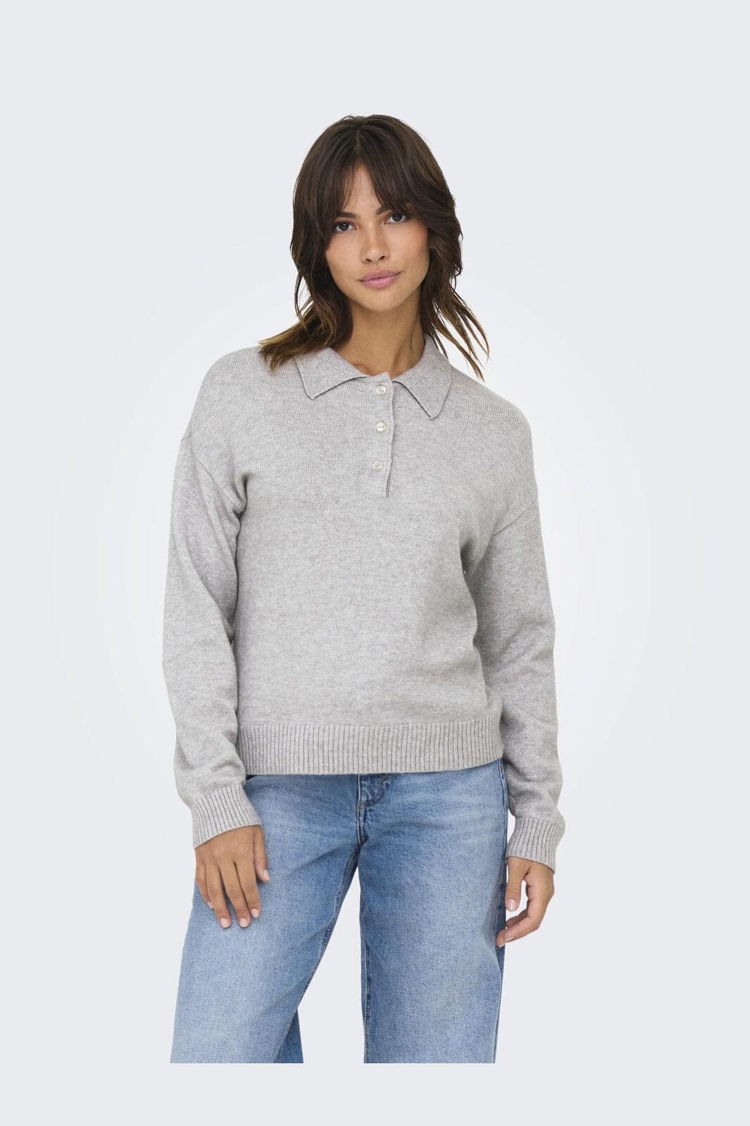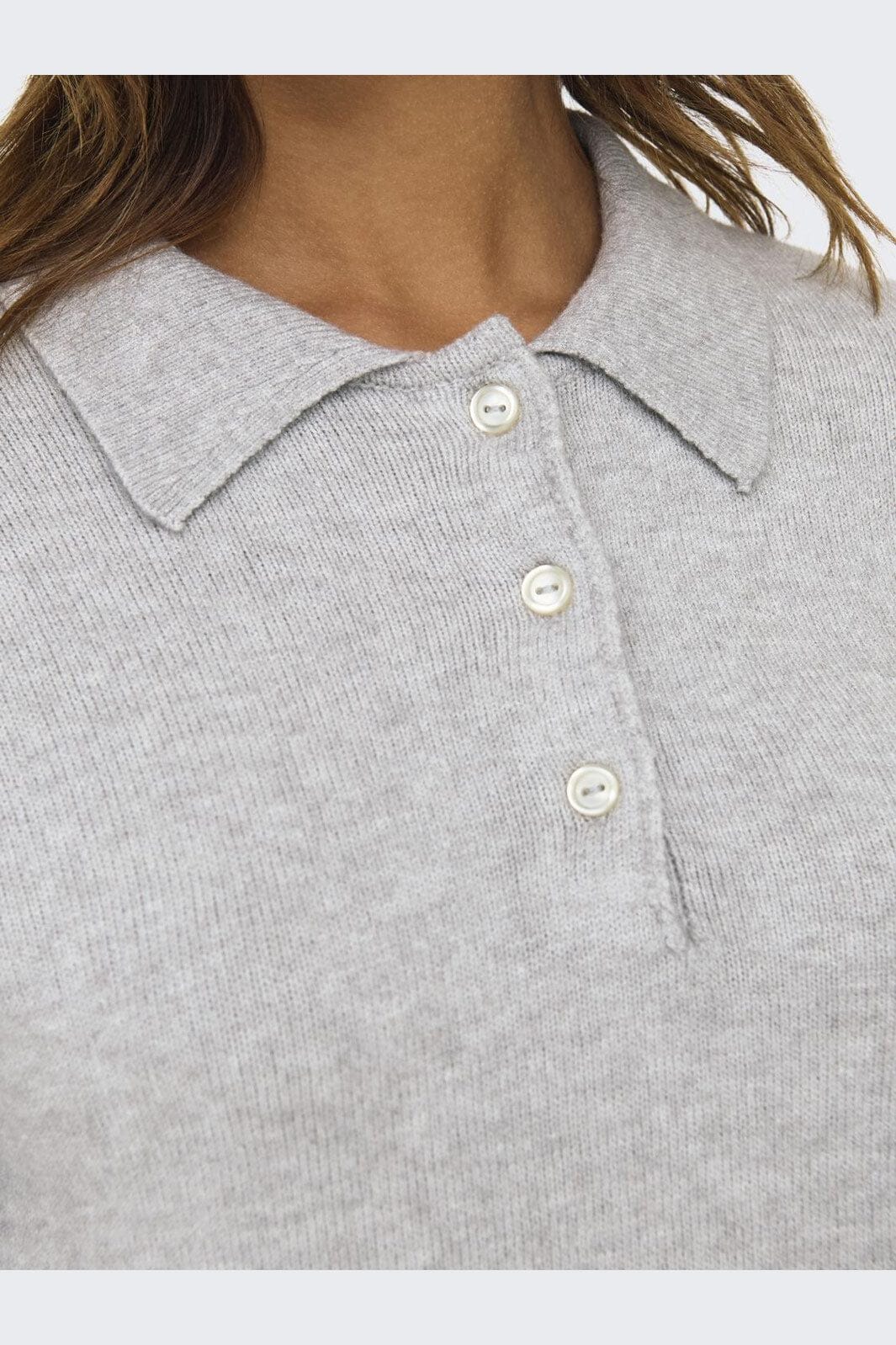 Hellgrauer Strickpullover von Only mit Polokragen und Knopfverschluss. Er hat lange Ärmel mit Manschetten und einen gerippten Saum unten.