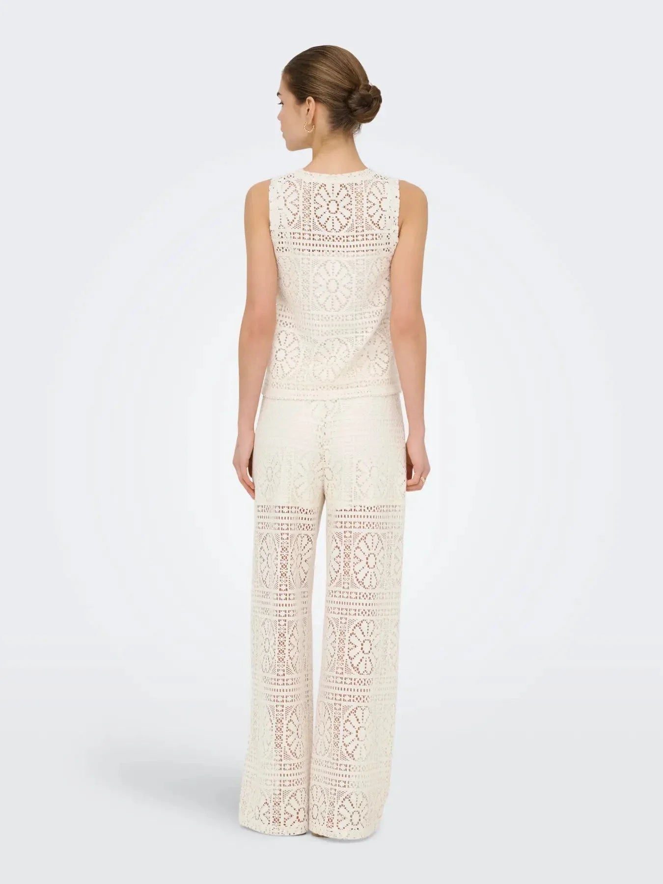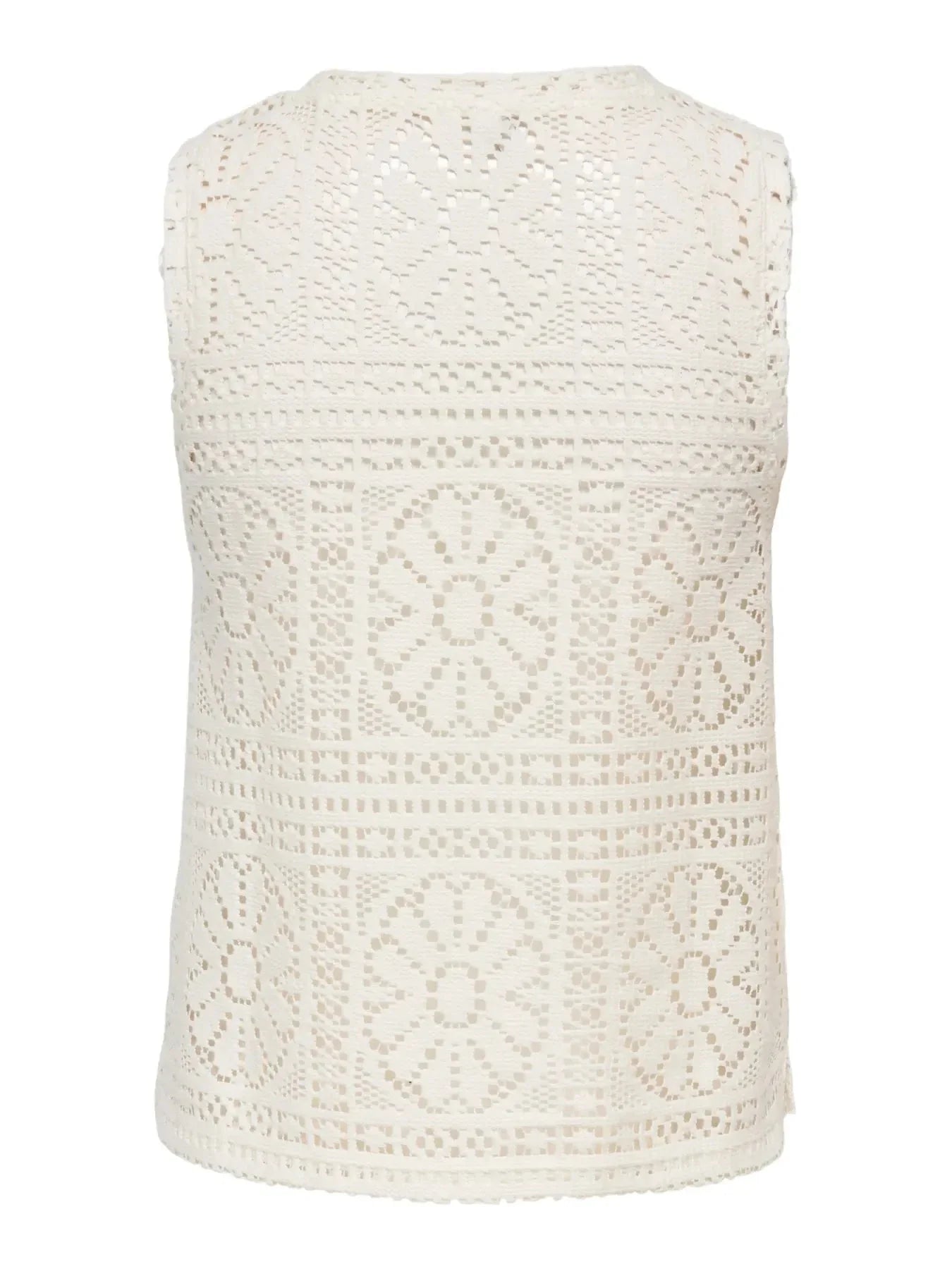 Ärmlose Tanktop von Only in einem hellen Cremefarbton mit durchgehendem Spitzendessin. Das Top hat einen runden Halsausschnitt und eine Regular-Fit-Passform.