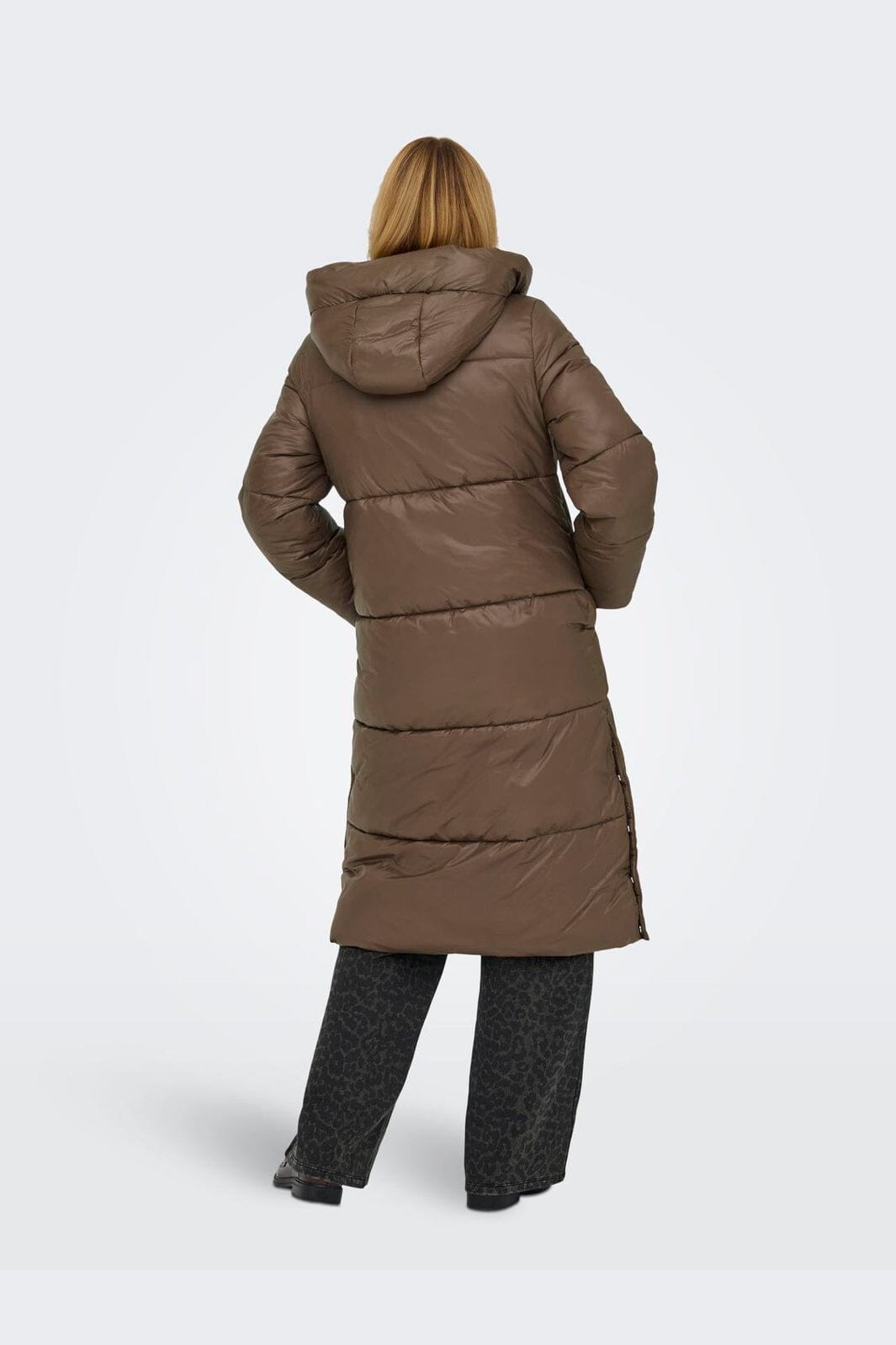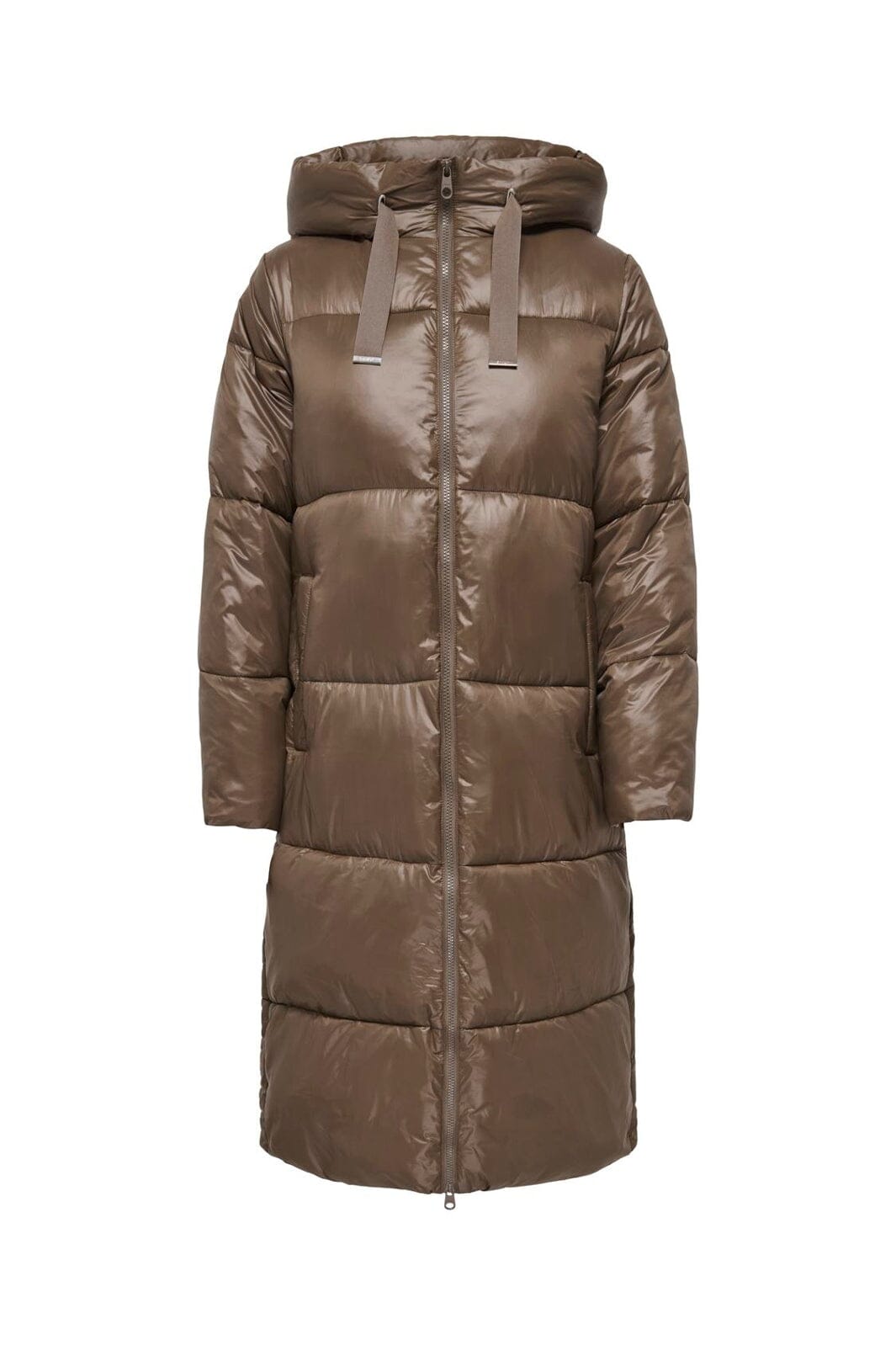 Lange Pufferjacke von Only in brauner Farbe. Die Jacke besteht aus 100 % Nylon und hat eine Kapuze mit Kordelzug.