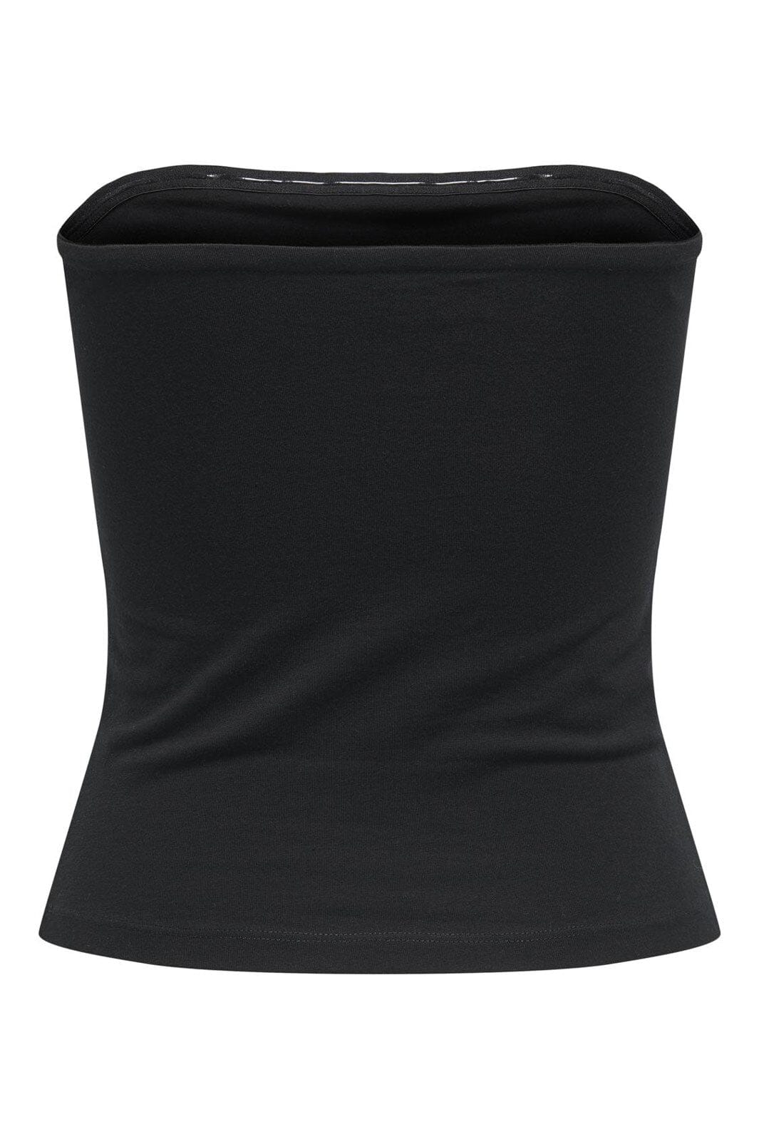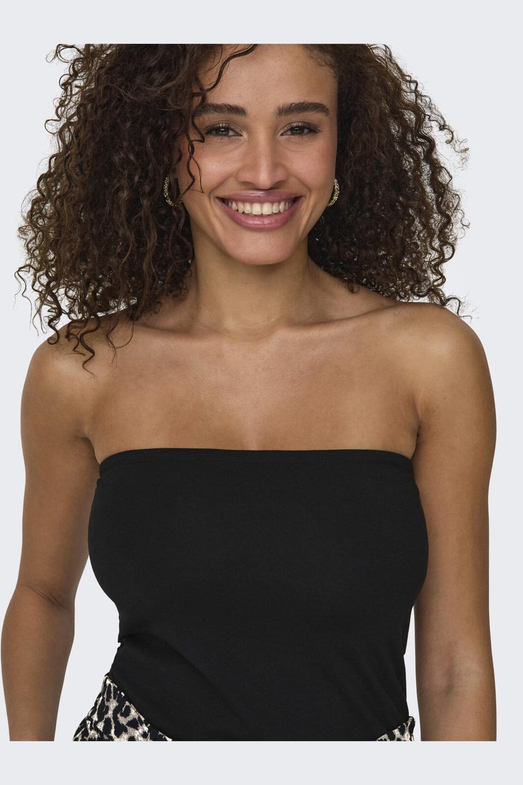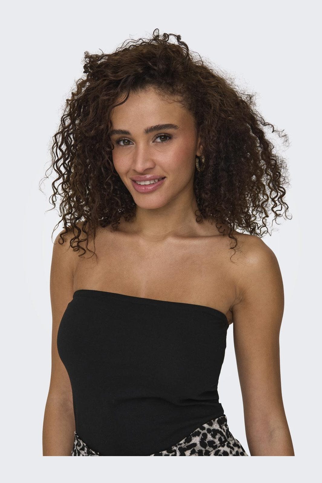 Schwarzes Tube Top von Only in einem ärmellosen Design mit Off-Shoulder-Ausschnitt. Das Top hat eine reguläre Passform und besteht aus Bio-Baumwolle mit Elasthan.