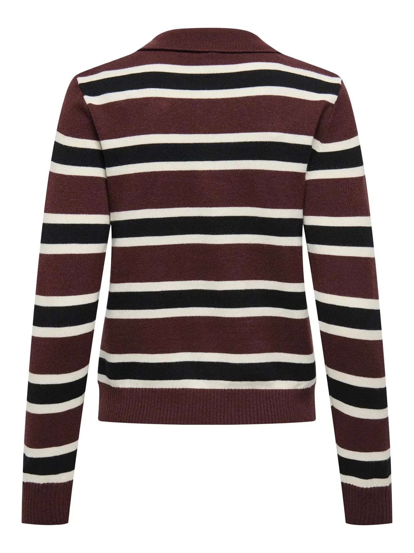 Gestreifter Polo-Strick von Only in braunen und bordeauxfarbenen Nuancen mit schwarzen und weißen Streifen. Der Strick hat einen Polo-Kragen und lange Ärmel.