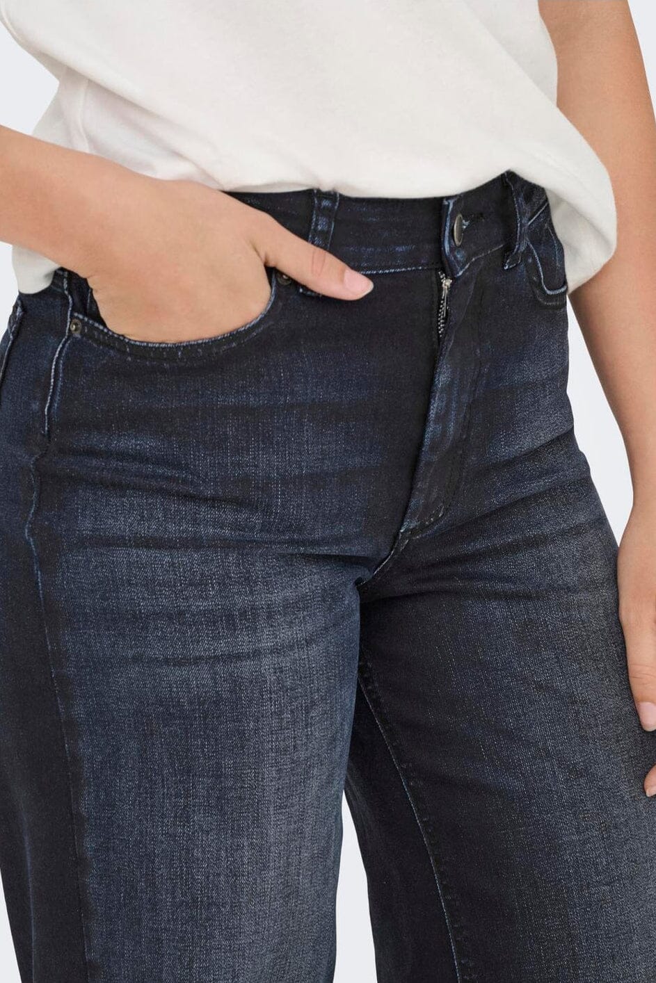 Dunkelblaue Jeans von Only mit hoher Taille und lockerem Schnitt. Die Jeans haben weite Beine von der Hüfte bis zum Knöchel und eine knöchellange Länge.