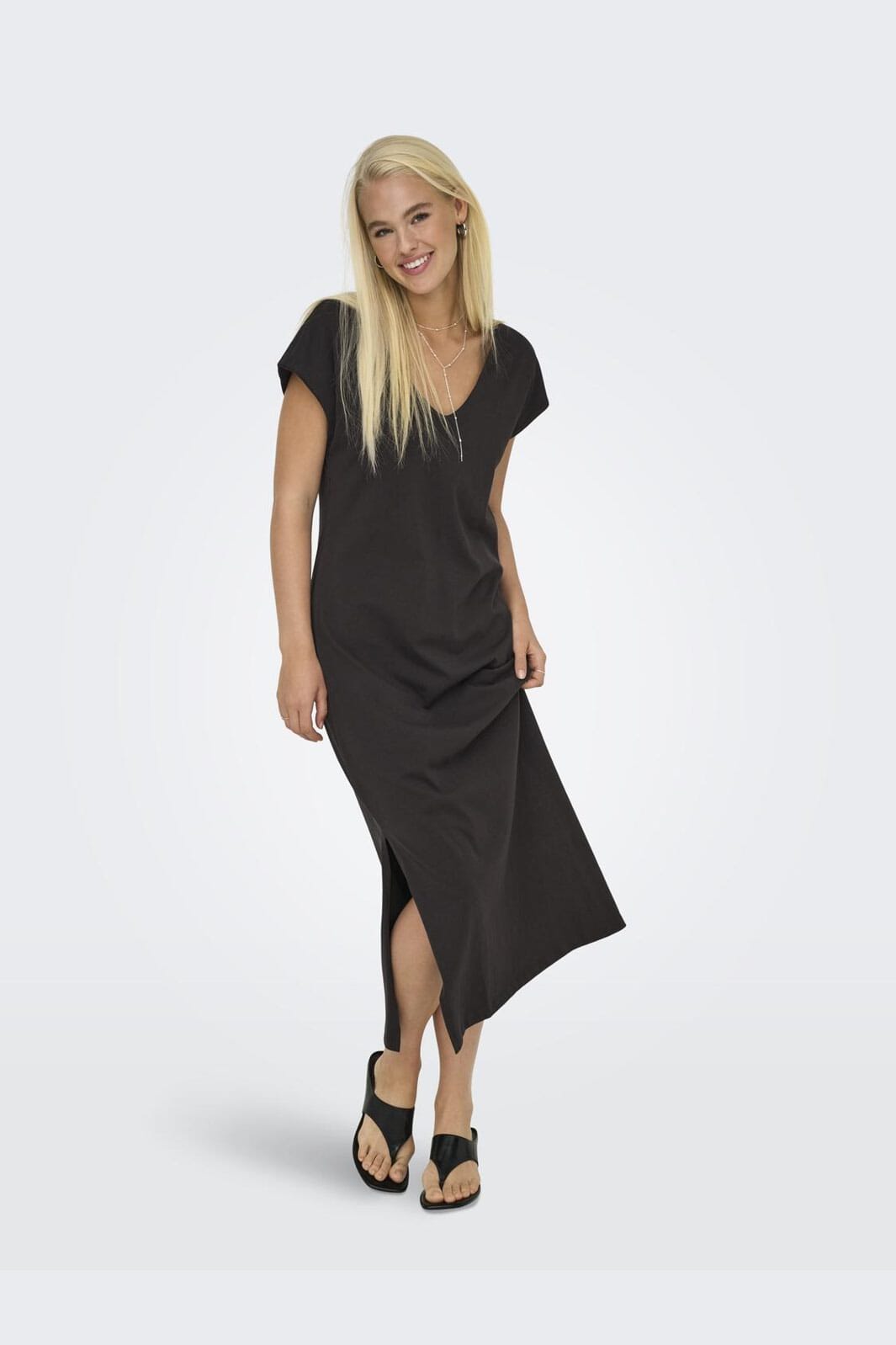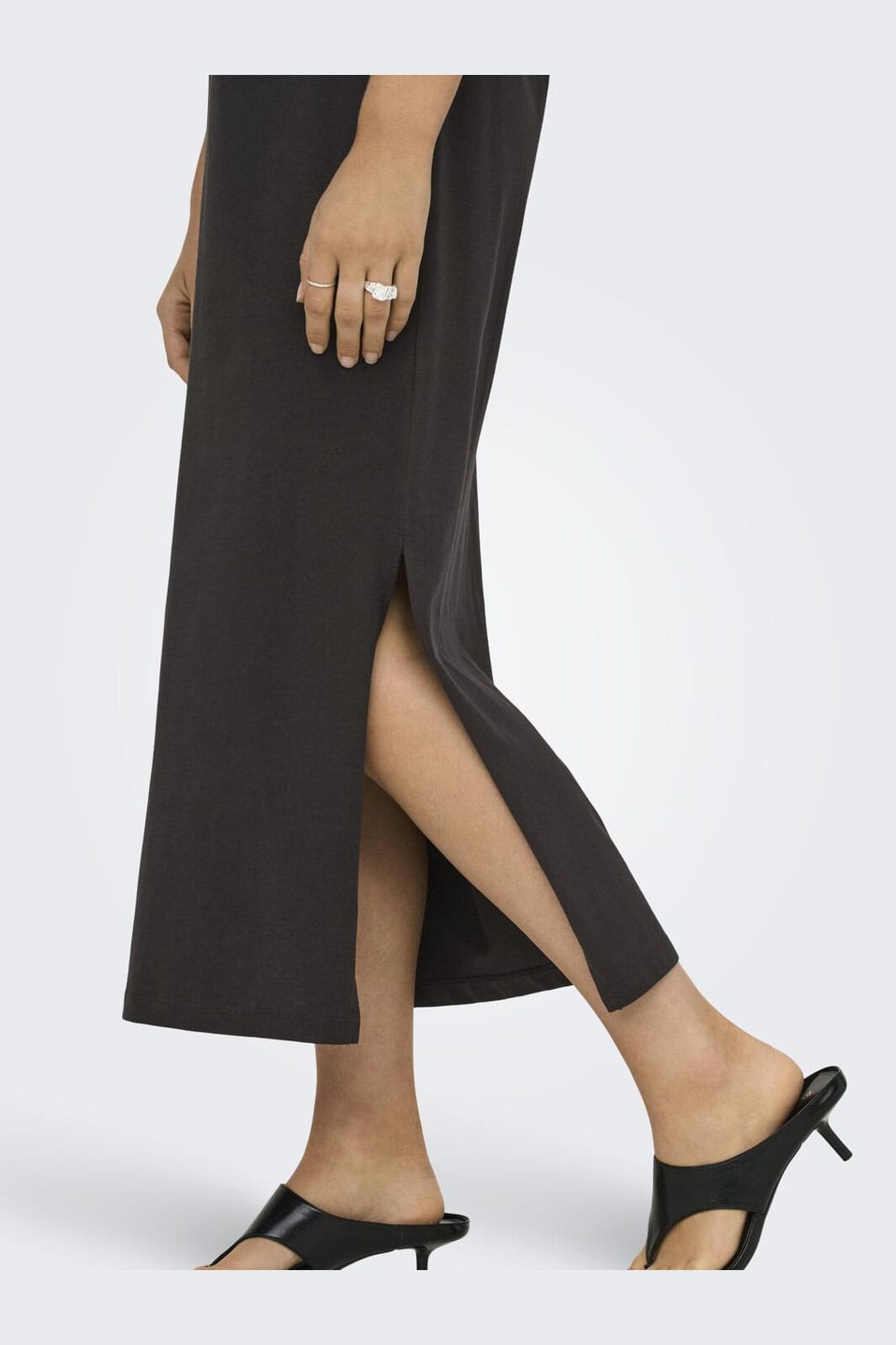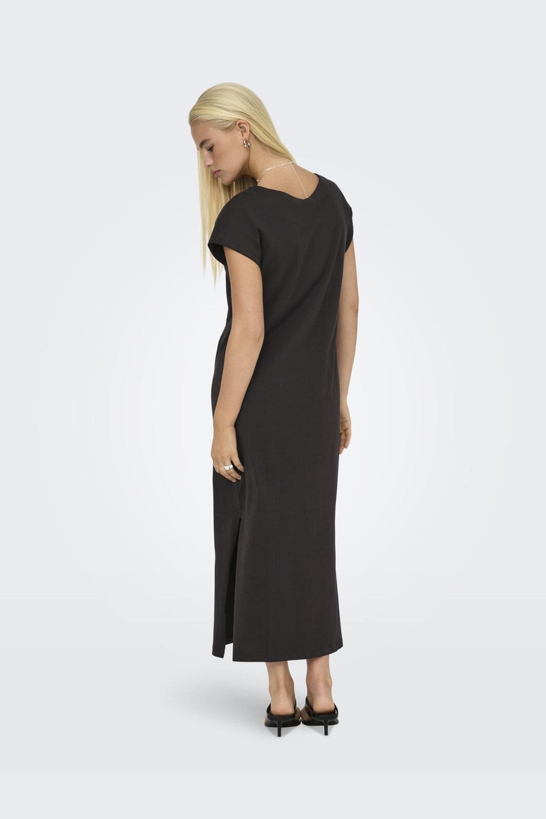 Ein Kleid von Only in einem dunklen Braunton. Es hat einen V-Ausschnitt und kurze Ärmel mit einer geraden Passform, die bis zu den Knöcheln reicht. Die Seitenschlitze bieten gute Bewegungsfreiheit.