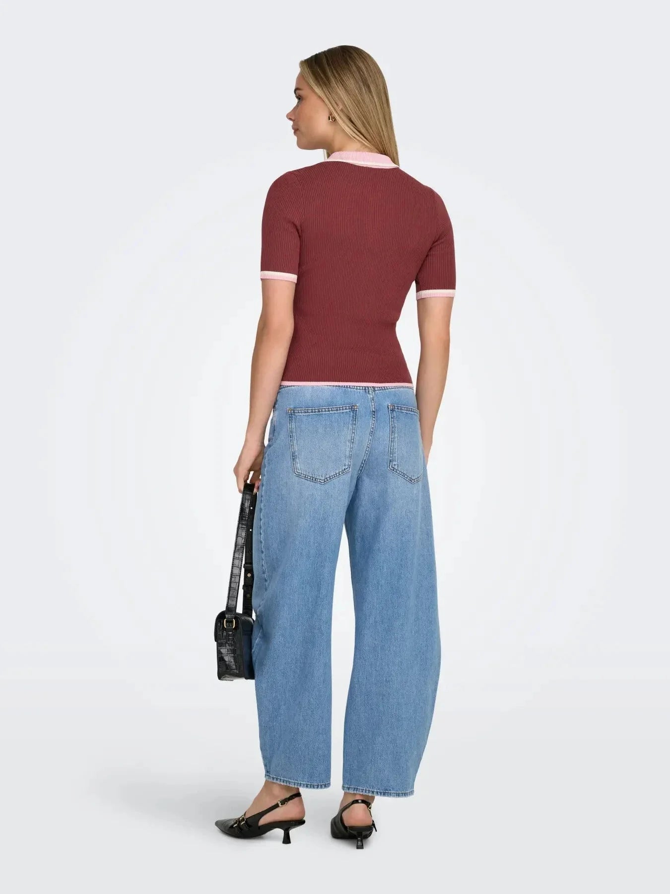 Polohemd von Only aus ribbsticktem Stoff. Das rotbraune Oberteil hat einen rosa Kontrastkragen und eine passende Knopfleiste vorne. Slim-Fit-Modell mit kurzen Ärmeln.