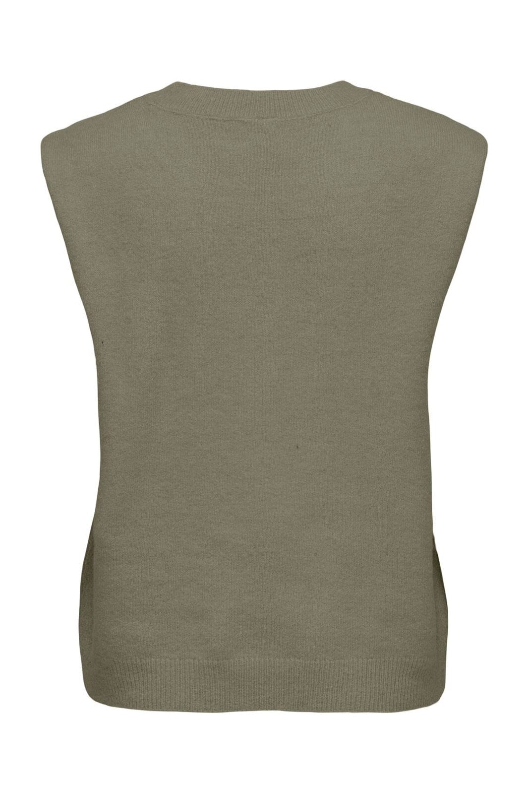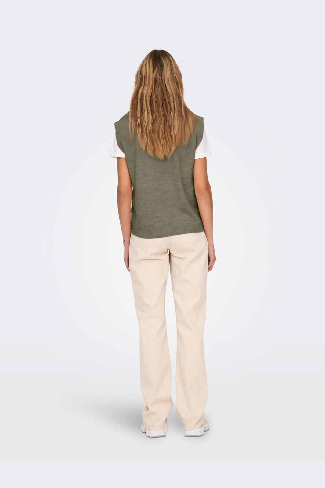 Ärmlose Weste von Only in khakigrüner Farbe mit gestickten goldenen Herzen, die über den Stoff verteilt sind. Die Weste hat einen Rundhalsausschnitt und Rippbündchen.