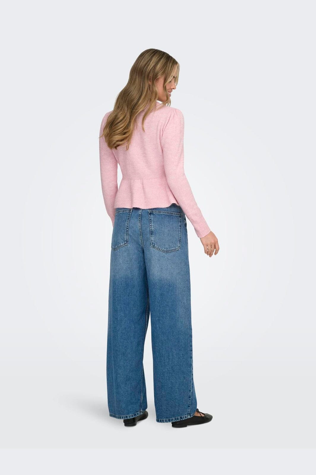 Rosa Cardigan von Only in einem Rosé-Melange-Ton. Die Strickjacke hat Perlenknöpfe, ein Peplum-Detail und Rippbündchen, die ihr einen femininen Ausdruck verleihen.