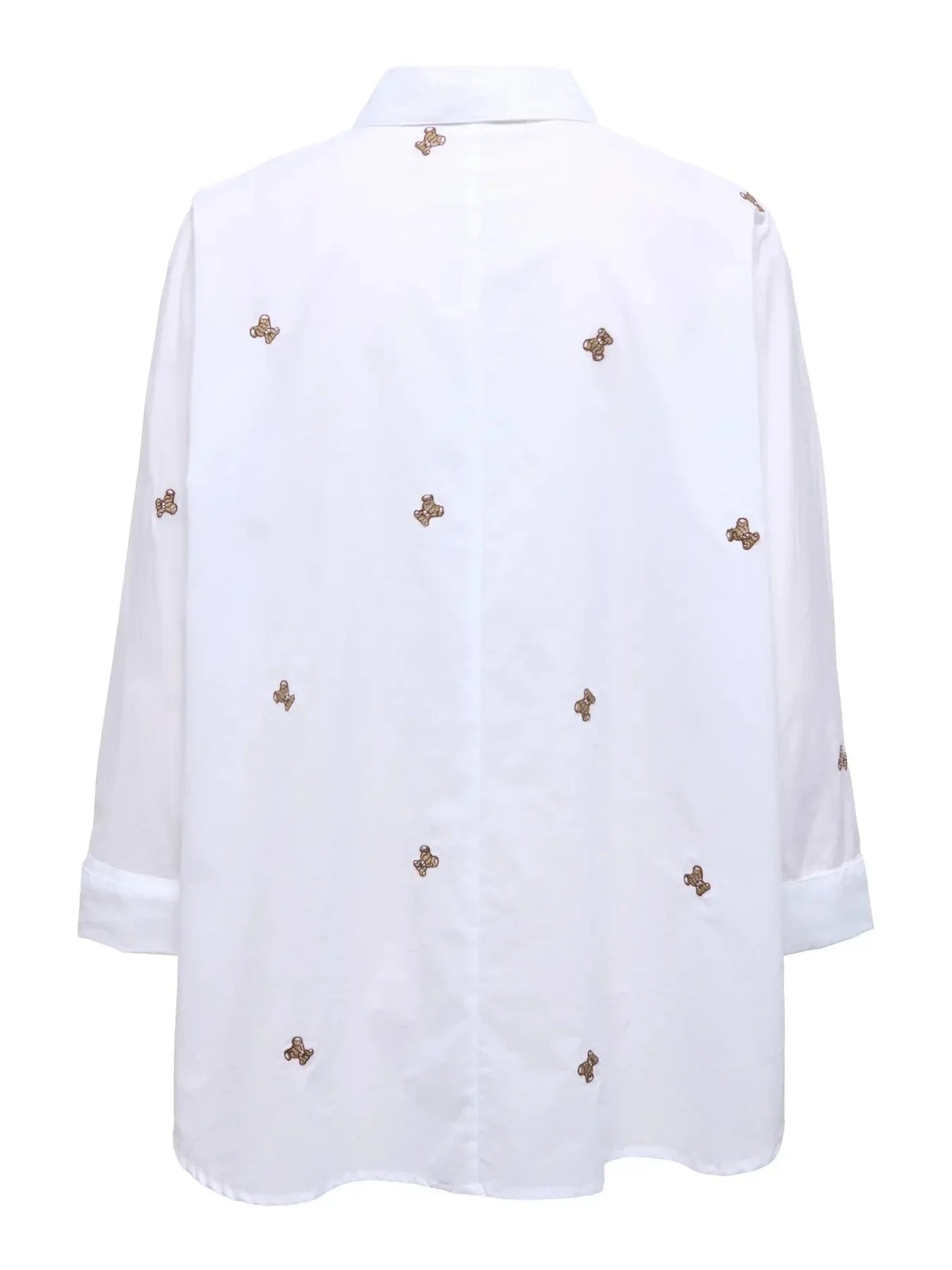 Weiße Bluse von Only mit kleinen gestickten Teddybärmotiven. Die Bluse hat eine boxy Passform und wird vorne mit Knöpfen geschlossen.