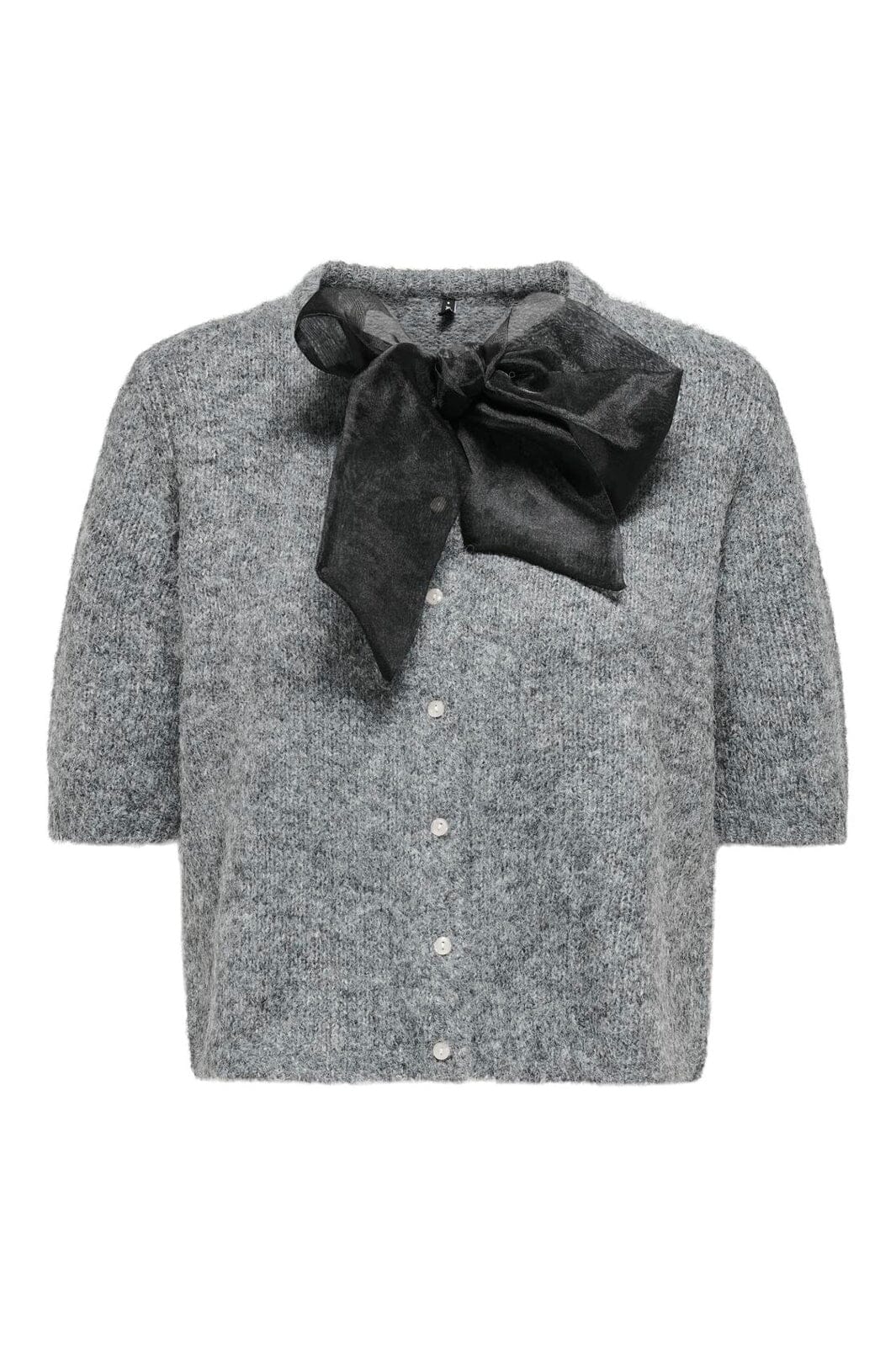 Dunkelgraue Cardigan von Only mit kurzärmeligem Design. Die Cardigan hat eine große schwarze Schleife am Hals und Knöpfe in der Mitte.