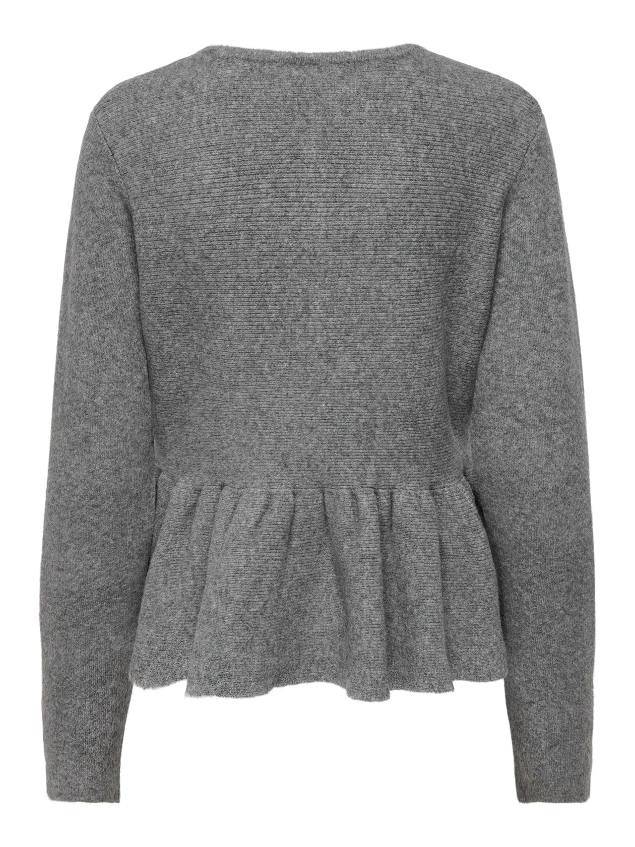 Hellgraue Strickjacke von Only mit Peplum-Detail in der Taille. Die Strickjacke hat eine Knopfleiste vorne, lange Ärmel und einen runden Halsausschnitt.