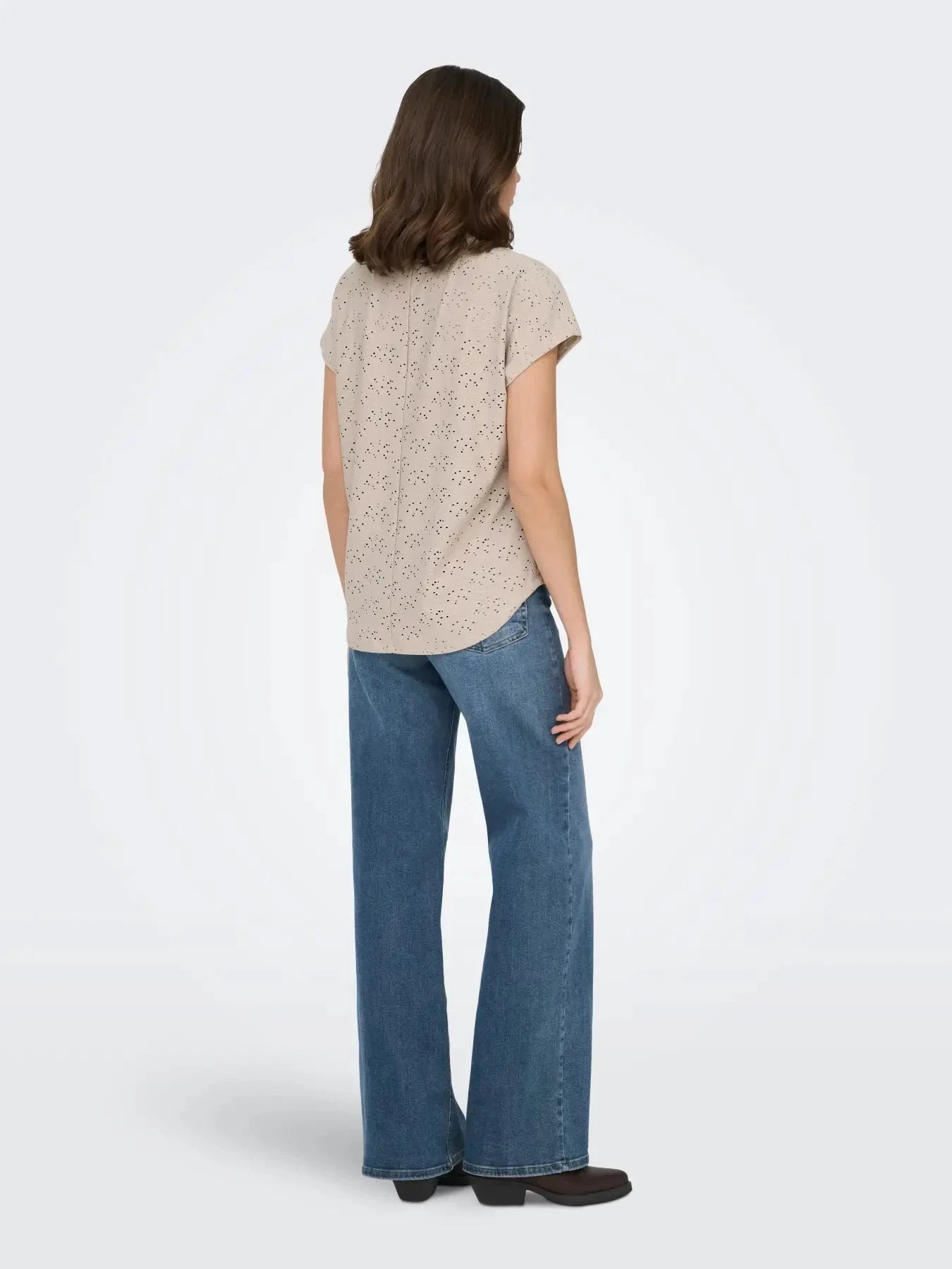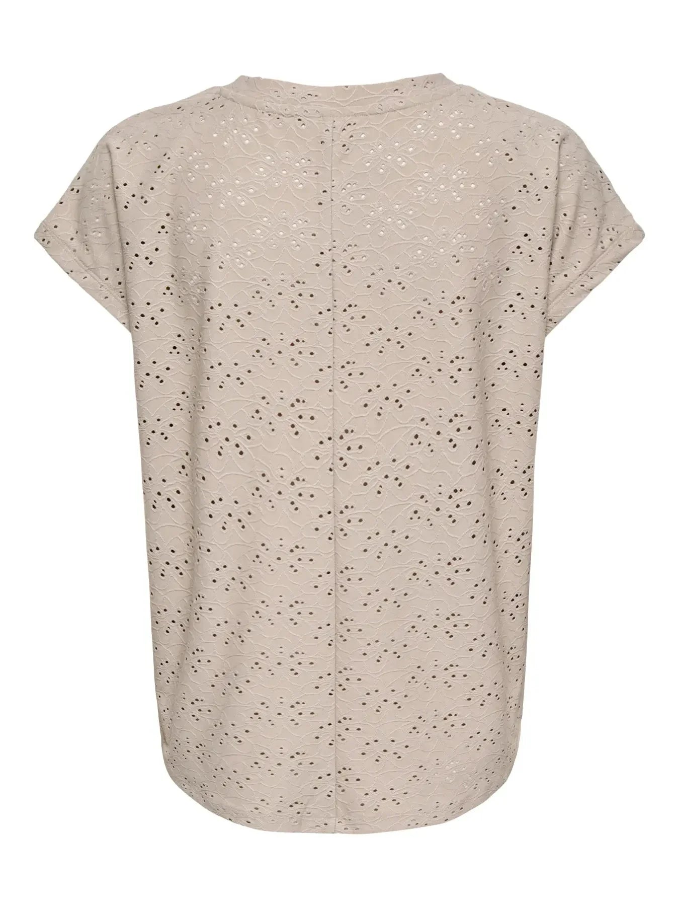Graues Top von Only mit Spitzendetails und Stickerei. Das Top ist in einem einfarbigen beige-grauen Ton gehalten und hat kurze Ärmel mit Umschlag.