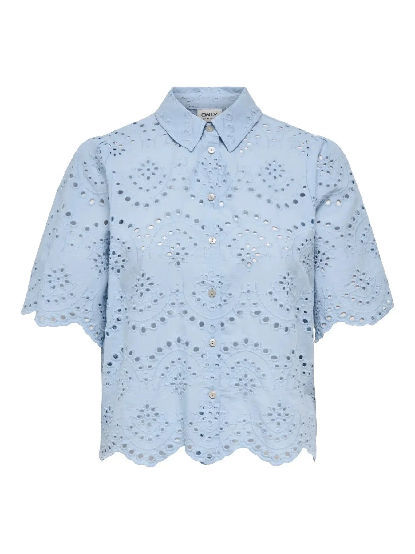 Ein kurzärmliges Hemd von Only aus hellblauer Baumwolle. Das Hemd hat gestickte Lochmuster, eine Knopfleiste vorne und einen welligen Saum an den Ärmeln und am unteren Abschluss.
