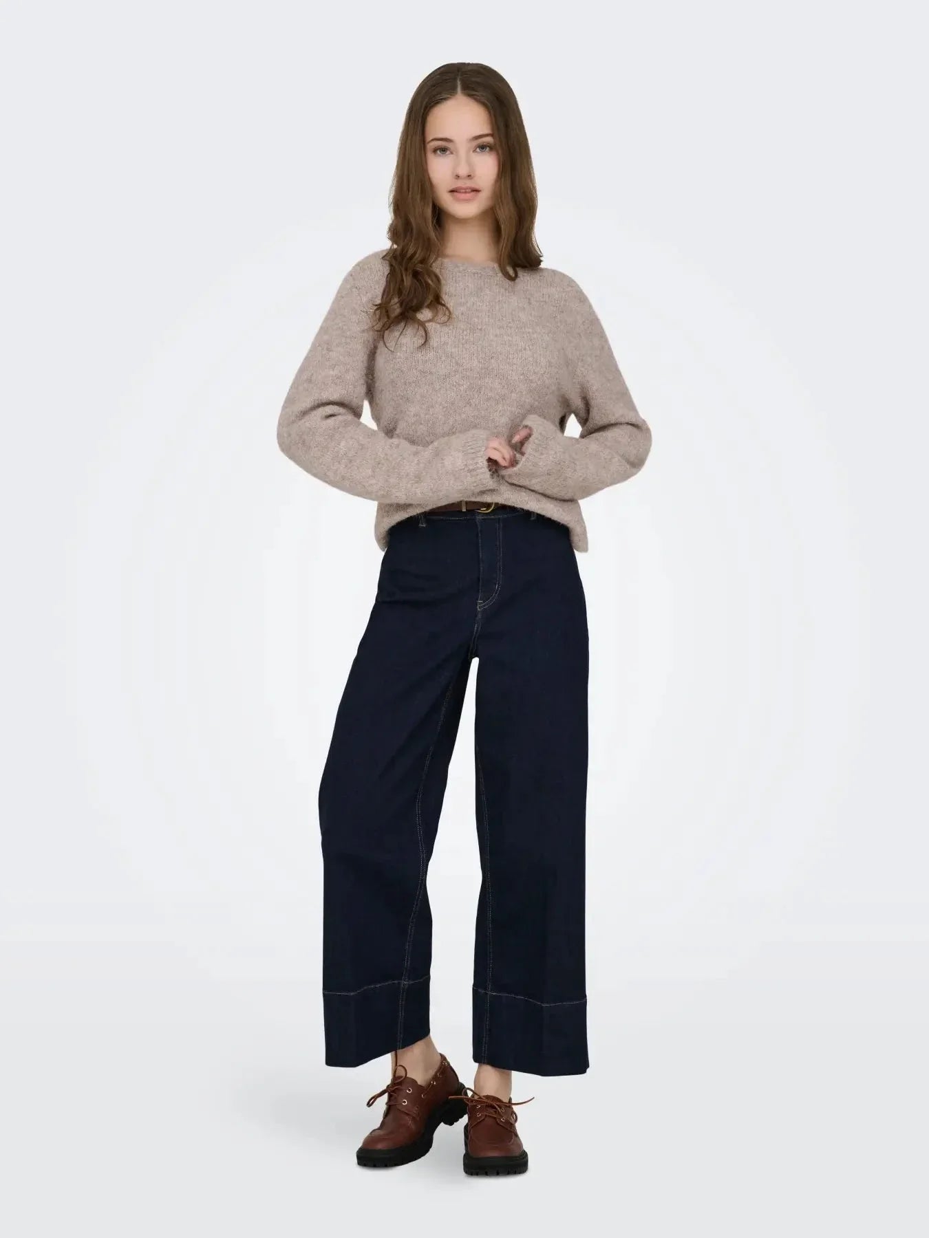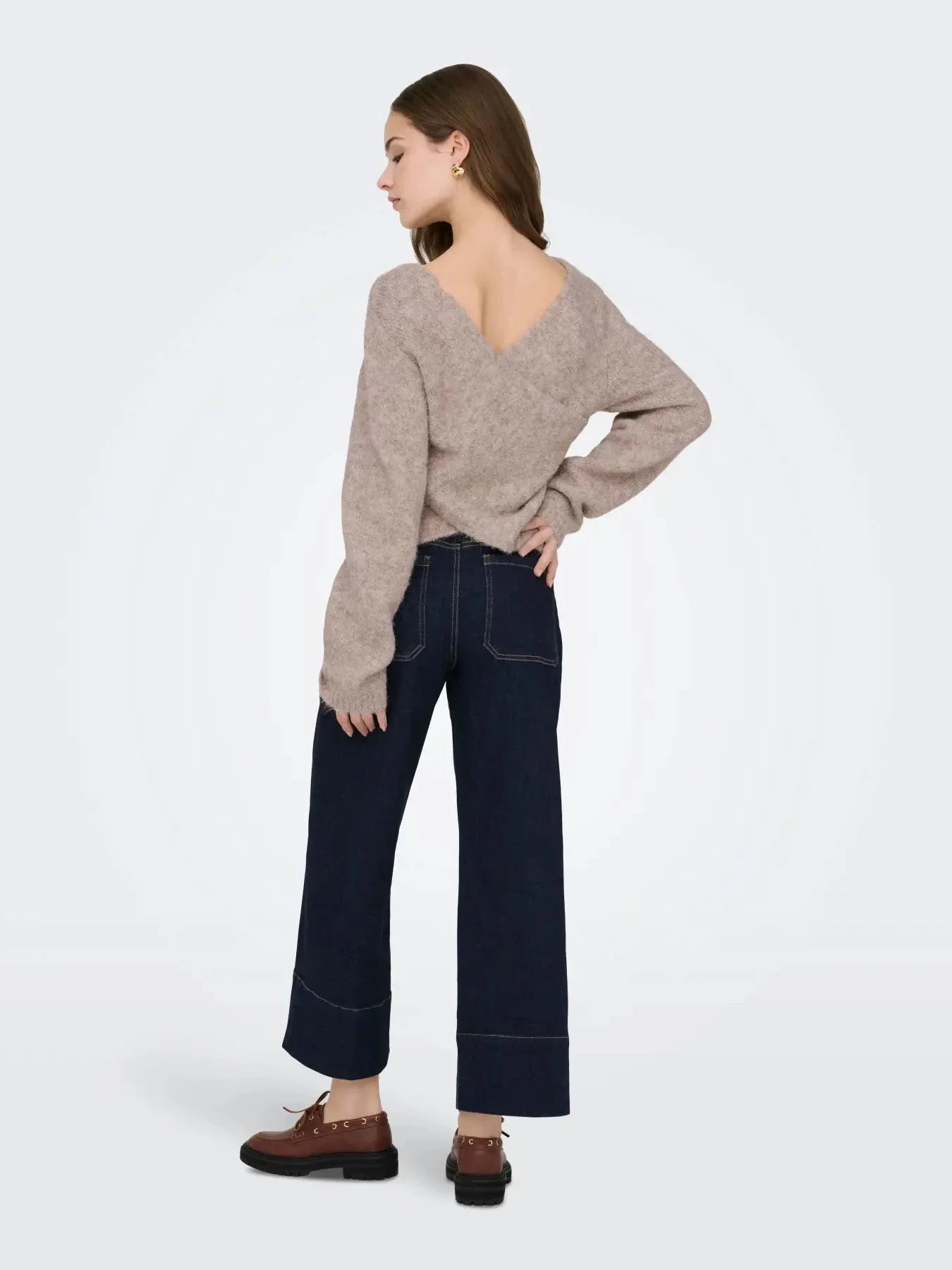 Beiger Strickpullover von Only mit melierter Oberfläche. Der Pullover ist wendbar mit sowohl V-Ausschnitt als auch Rundhalsausschnitt.