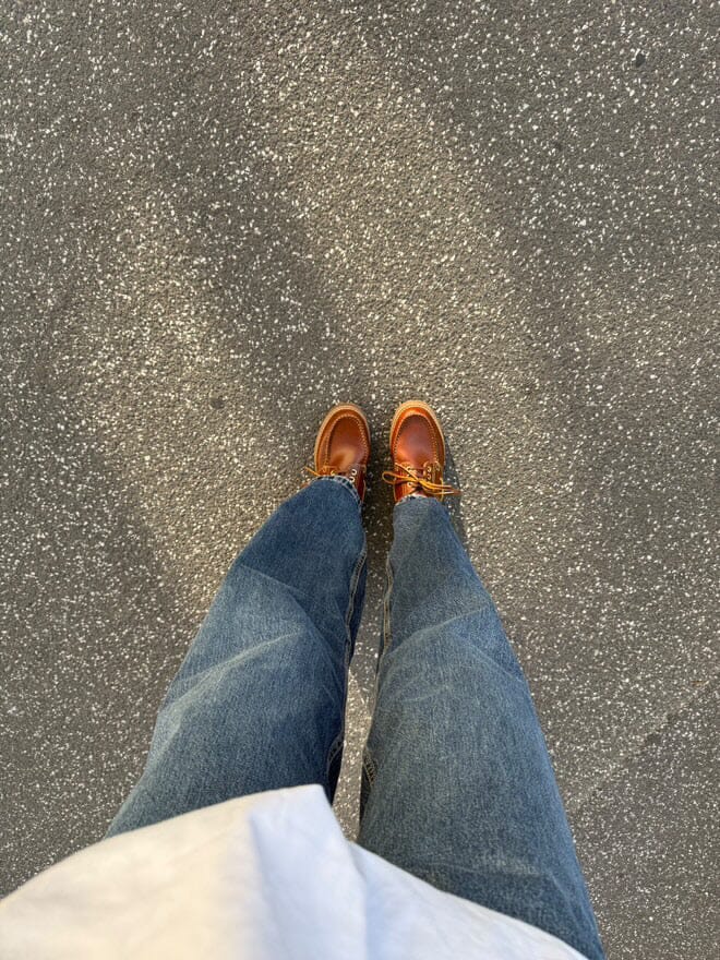 Lederschuhe in Brandy-Farbe mit runder Zehe und Schnürung. Die Schuhe haben einen niedrigen Absatz und sind aus weichem Leder mit sichtbaren Nähten entlang der Kante gefertigt.