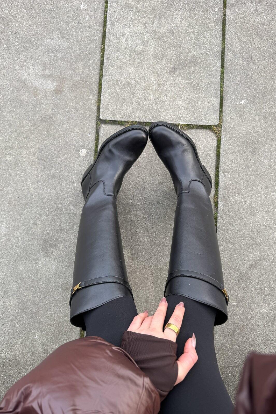 Hoher Stiefel von Phenumb Copenhagen aus schwarzem Leder. Der Stiefel hat einen hohen Schaft, der bis zum Knie reicht, und eine dekorative Schnalle nahe dem oberen Rand.