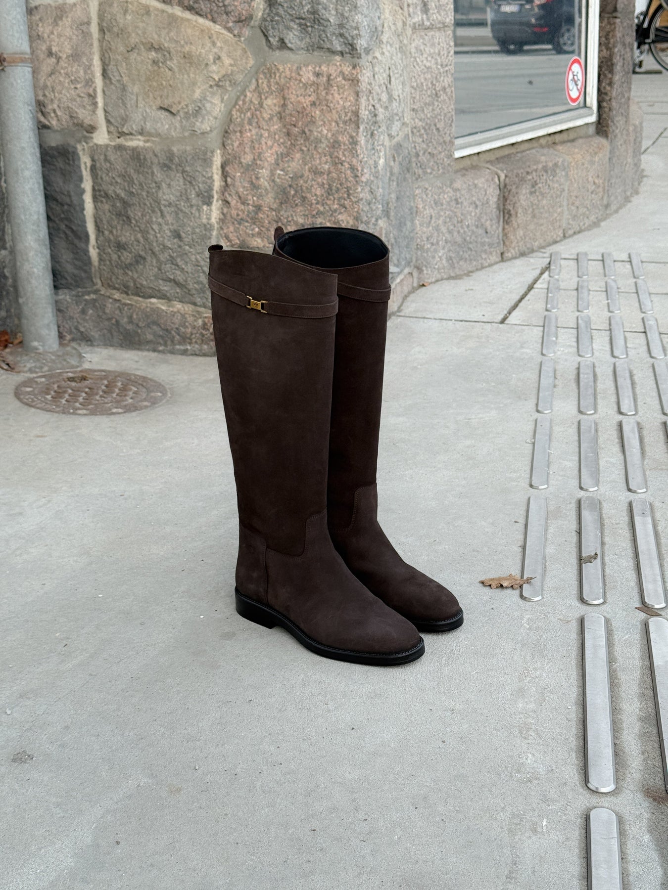 Kniehohe Stiefel von Phenumb Copenhagen aus Wildleder in einem dunkelbraunen Farbton. Die Stiefel haben eine flache schwarze Sohle und eine kleine goldfarbene Schnalle oben.