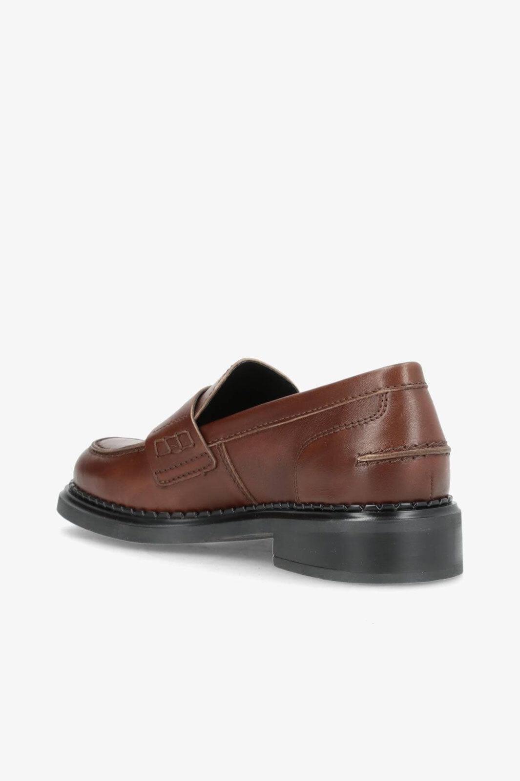 Braune Loafer von Phenumb Copenhagen aus gewaschenem Leder mit quadrater Zehenform. Der Schuh hat einen niedrigen Blockabsatz und dekorative Nähte entlang der Kante.