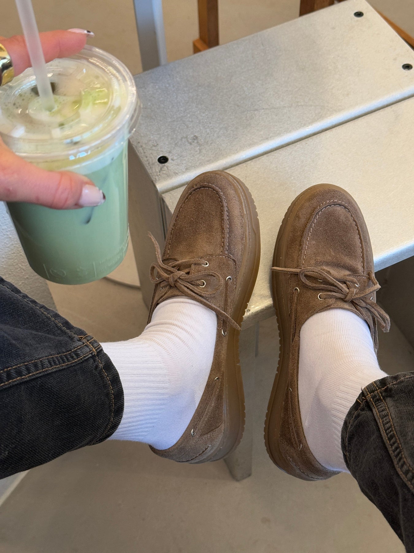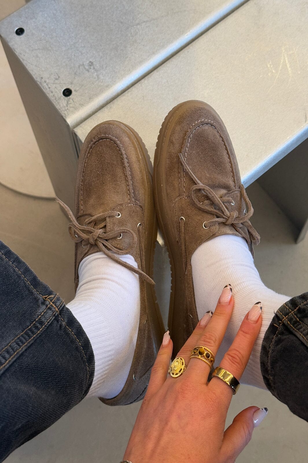 Braune Schuhe von Phenumb Copenhagen aus Wildleder mit runder Zehe und Schnürung. Der Schuh hat einen niedrigen Absatz und eine solide Konstruktion, die ihn praktisch für den Alltag macht.