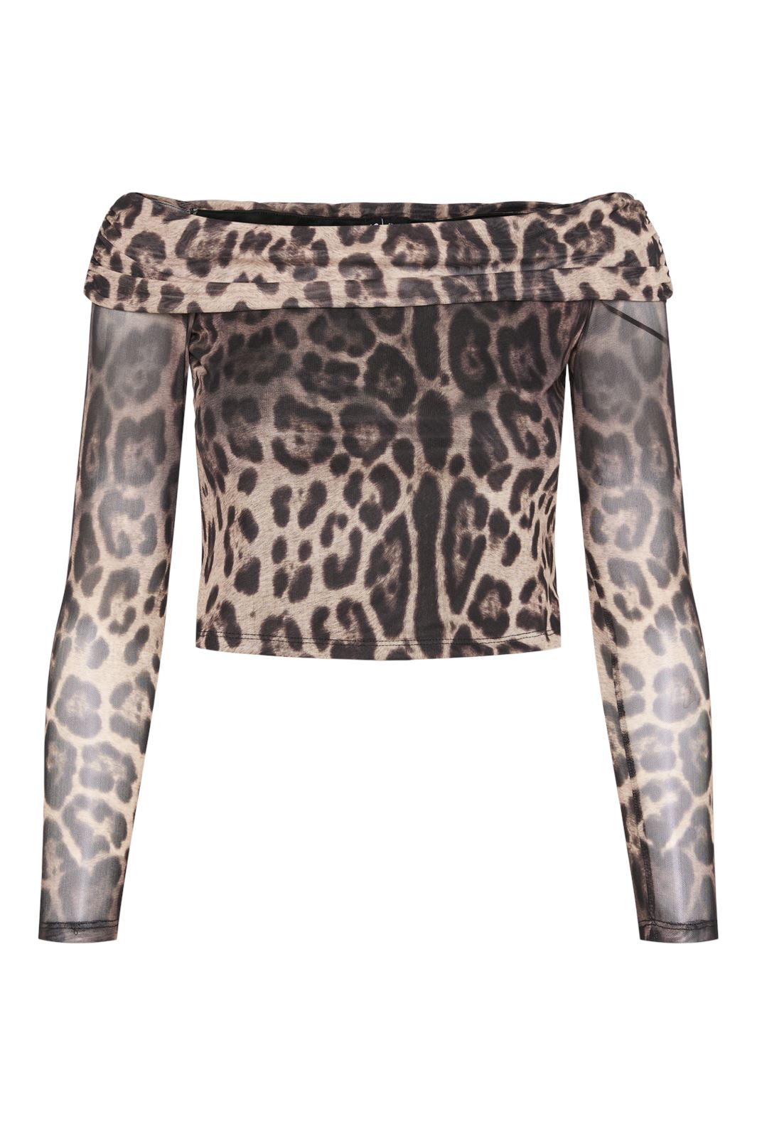 Off-shoulder Top von Pieces mit schwarz-beigem Leopardenmuster. Der Top hat lange durchsichtige Ärmel und eine reguläre Passform, die gute Bewegungsfreiheit bietet.