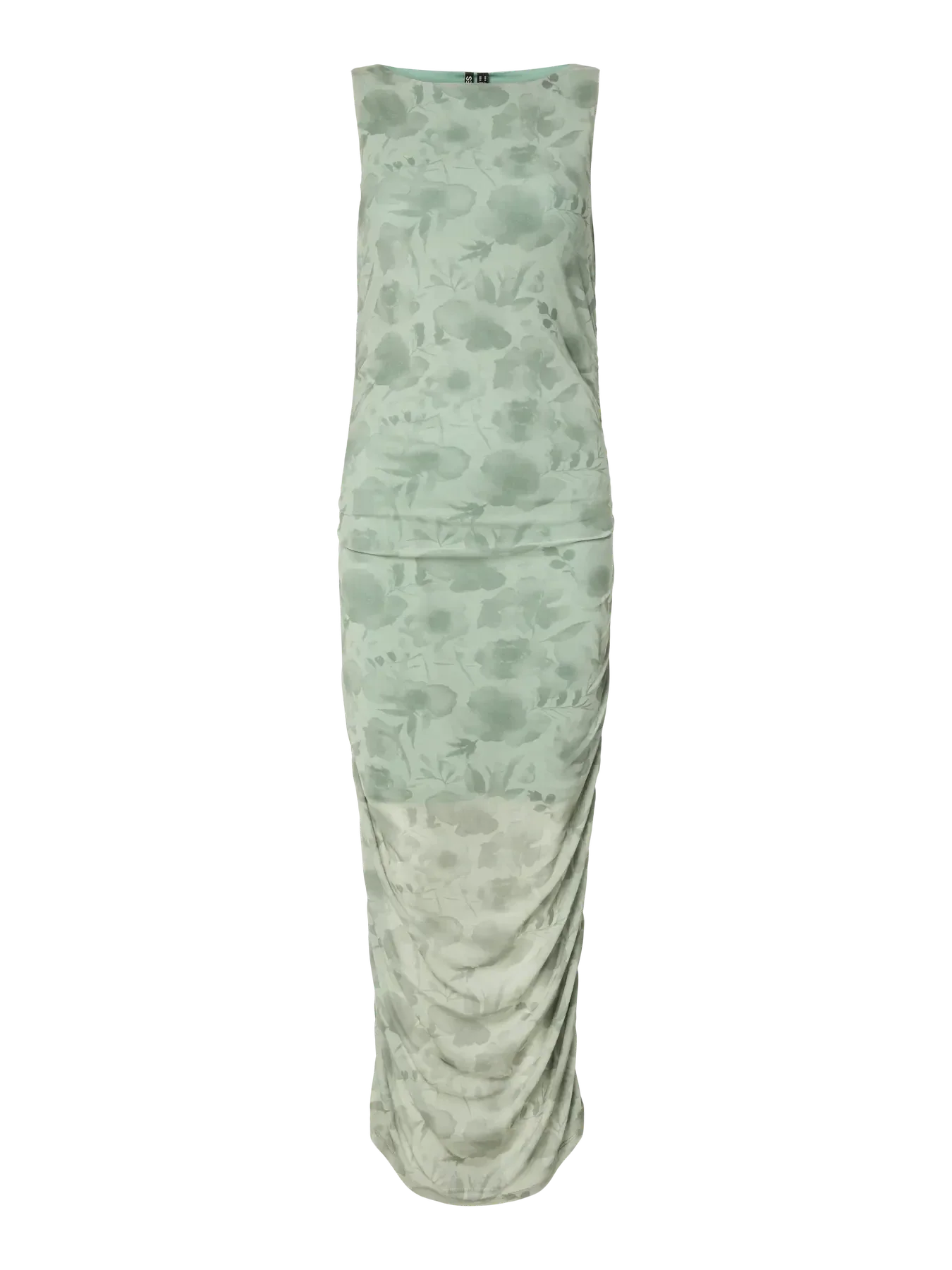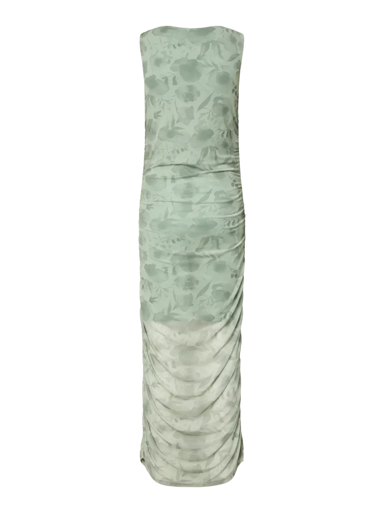 Ein knöchellanges Kleid von Pieces aus elastischem Mesh in einem grünlichen Farbton. Das Kleid hat ein durchgehendes Blumenmuster und Rüschen.