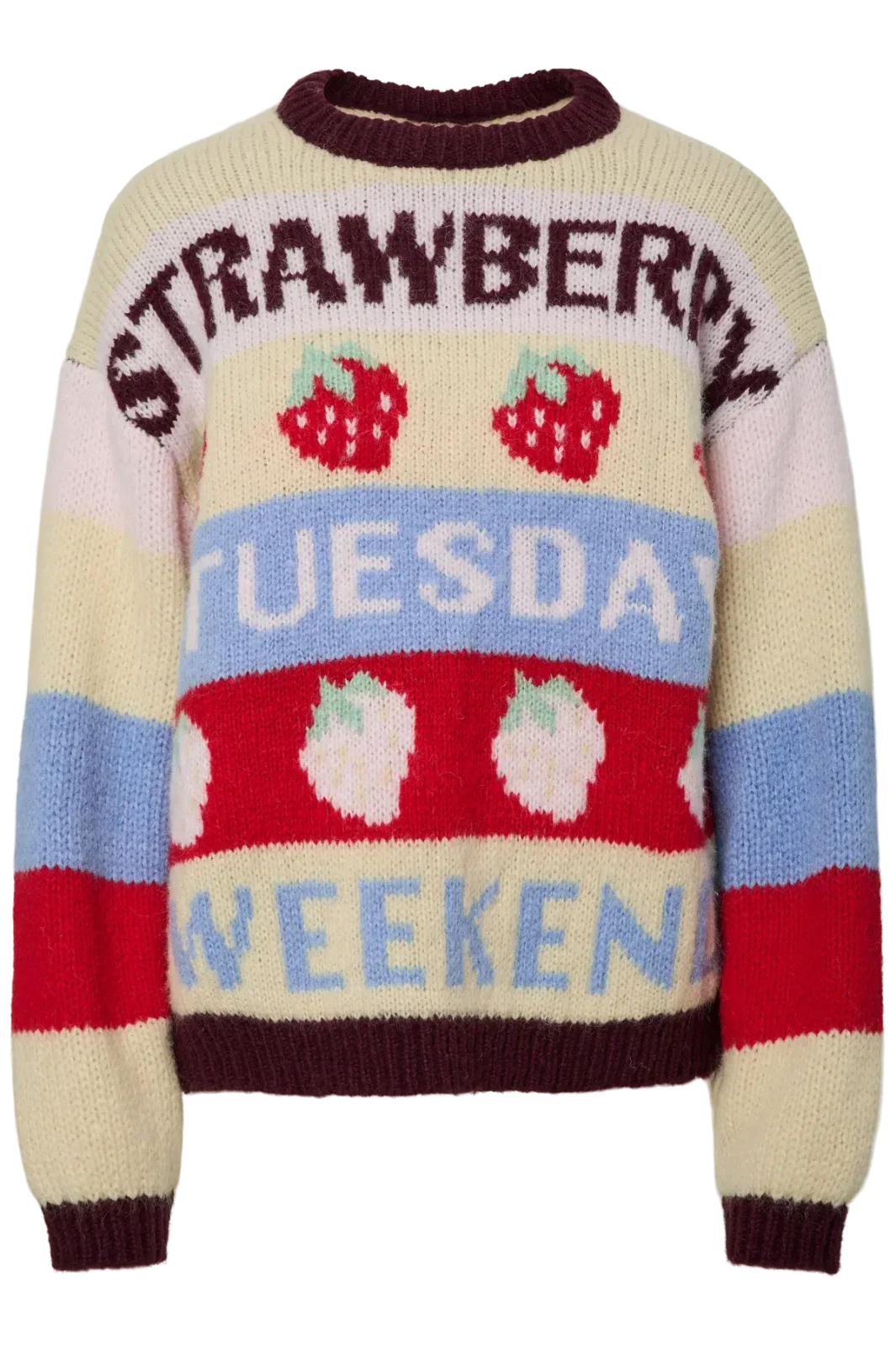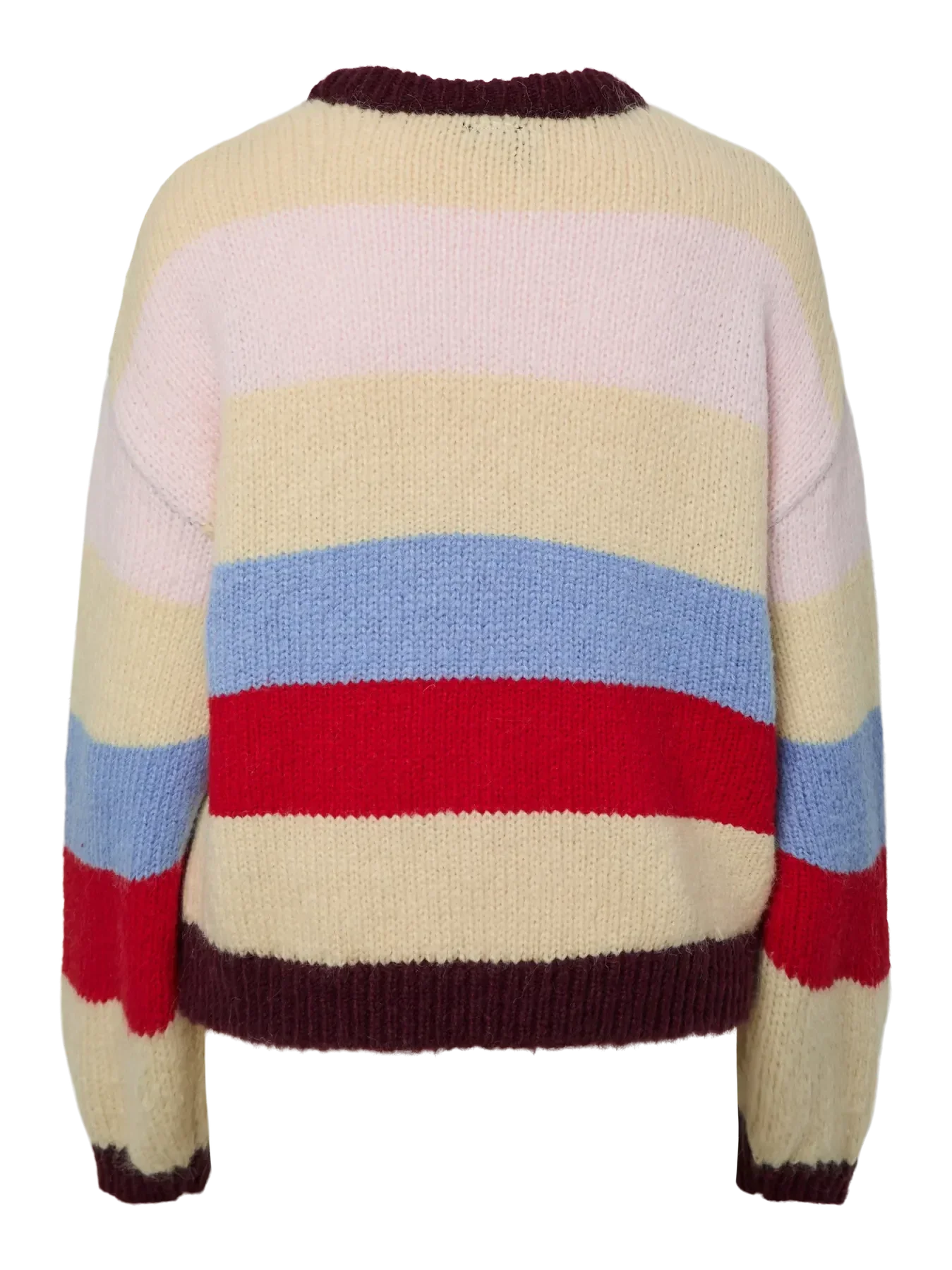 Ein mehrfarbiger Strickpullover von Pieces mit grafischen Elementen und Text. Der Pullover hat eine beige Basis mit Streifen in Rot, Blau und Braun.