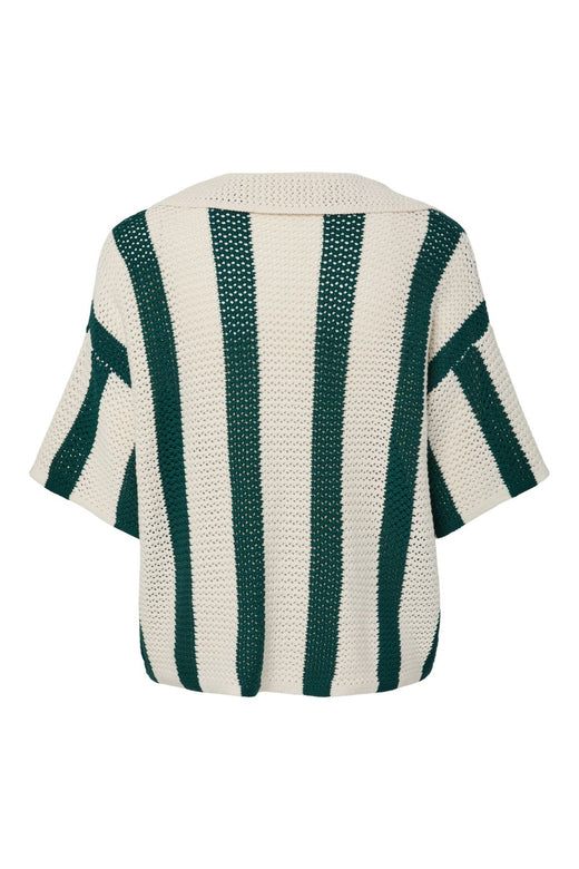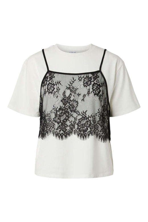 Schwarzes Top von Pieces mit gehäkelter Spitze in einem Blumen- und geometrischen Muster. Das kurze Top hat einen runden Ausschnitt und kurze Ärmel.