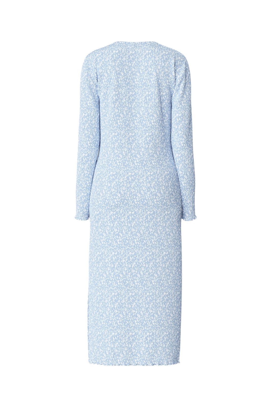 Himmelblaue Midi-Kleid von Pieces mit kleinen weißen Blumen. Das Kleid hat ein plissiertes Design, lange Ärmel und einen runden Halsausschnitt. Das figurbetonte Modell reicht bis zur Mitte der Wade.