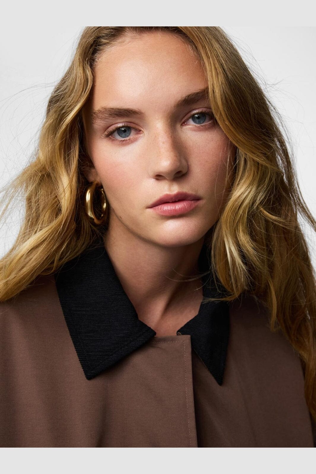 Kurze Jacke von Pieces, aus Polyester mit einer seidenähnlichen Oberfläche. Die Jacke ist braun mit schwarzem Kragen und schwarzen Manschetten.