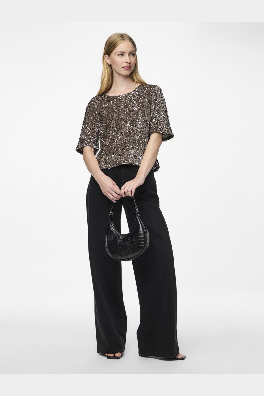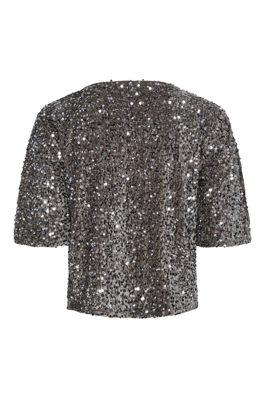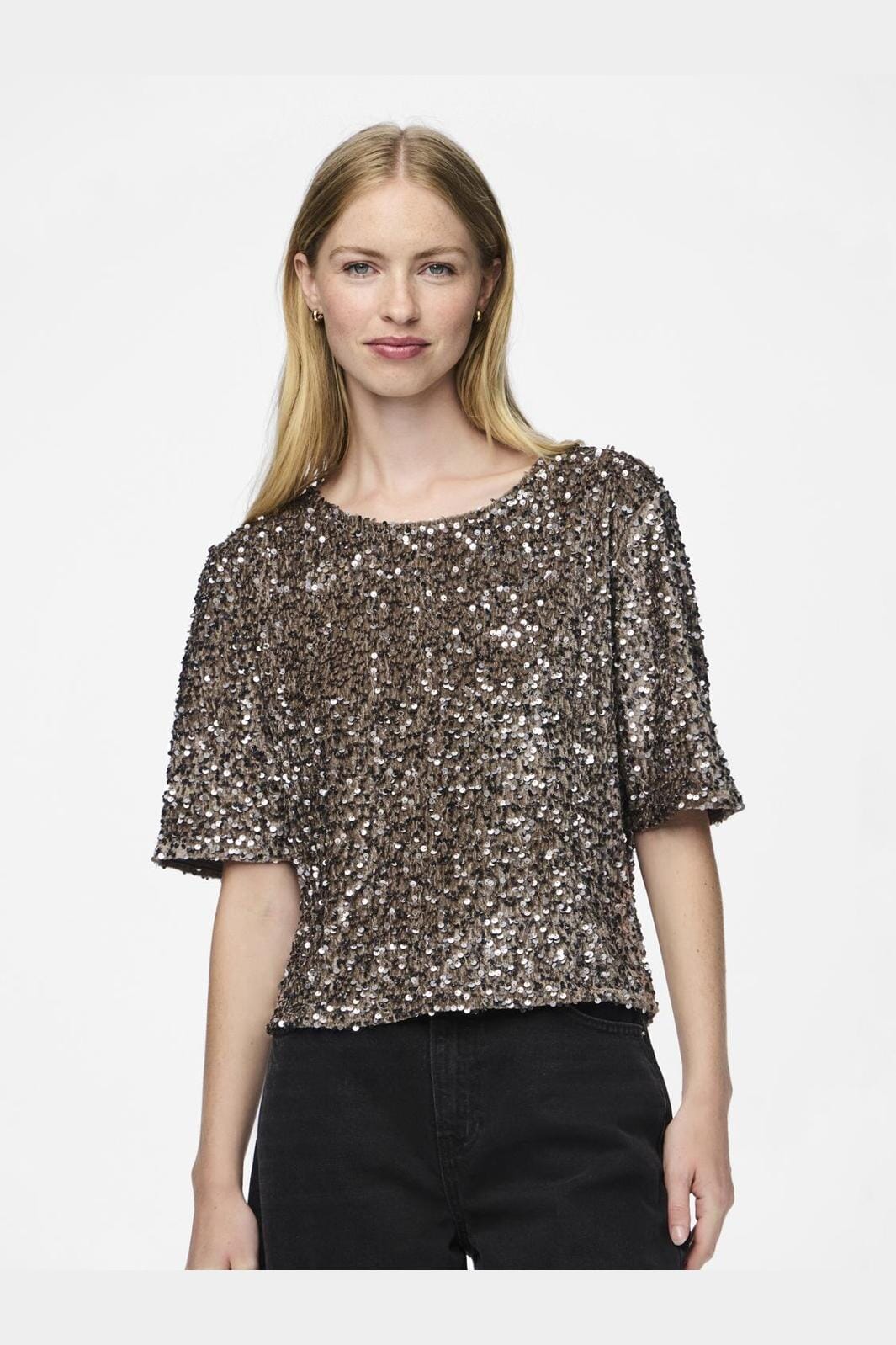 Kurzärmliges Top von Pieces in Braun und Silber. Das Top ist vollständig mit glänzenden Pailletten bedeckt und hat einen runden Halsausschnitt. Es ist in einer Regular Fit genäht, die gute Bewegungsfreiheit bietet.