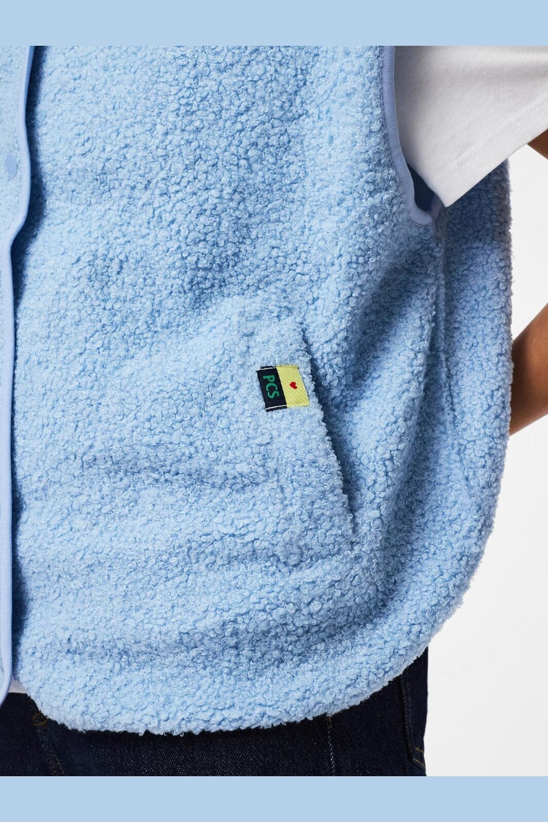 Hellblaue Teddyweste von Pieces, aus 100 % recyceltem Polyester mit einer weichen Oberfläche. Die Weste hat einen V-Ausschnitt und einen Druckknopfverschluss.