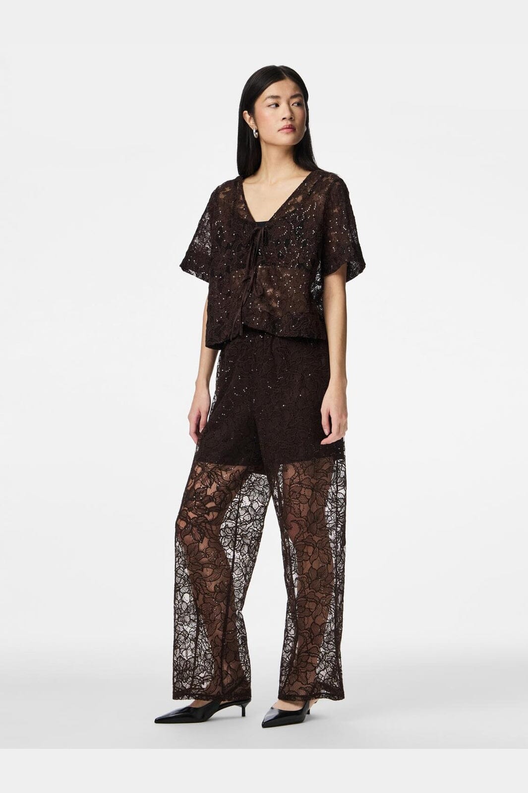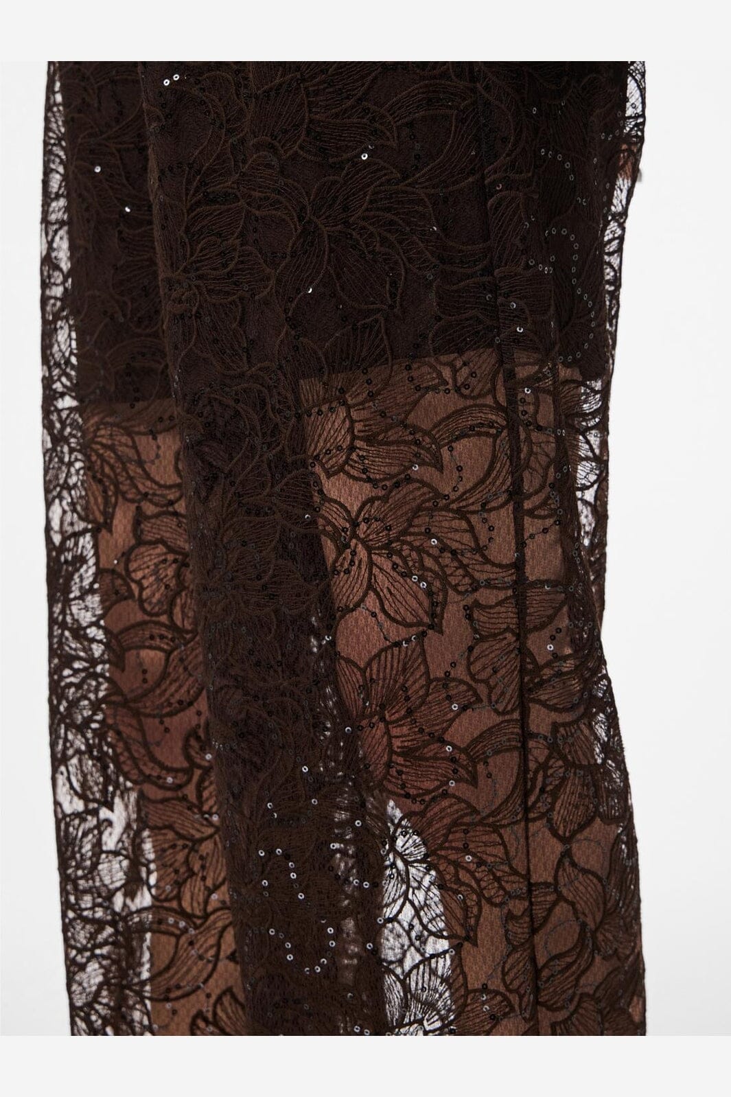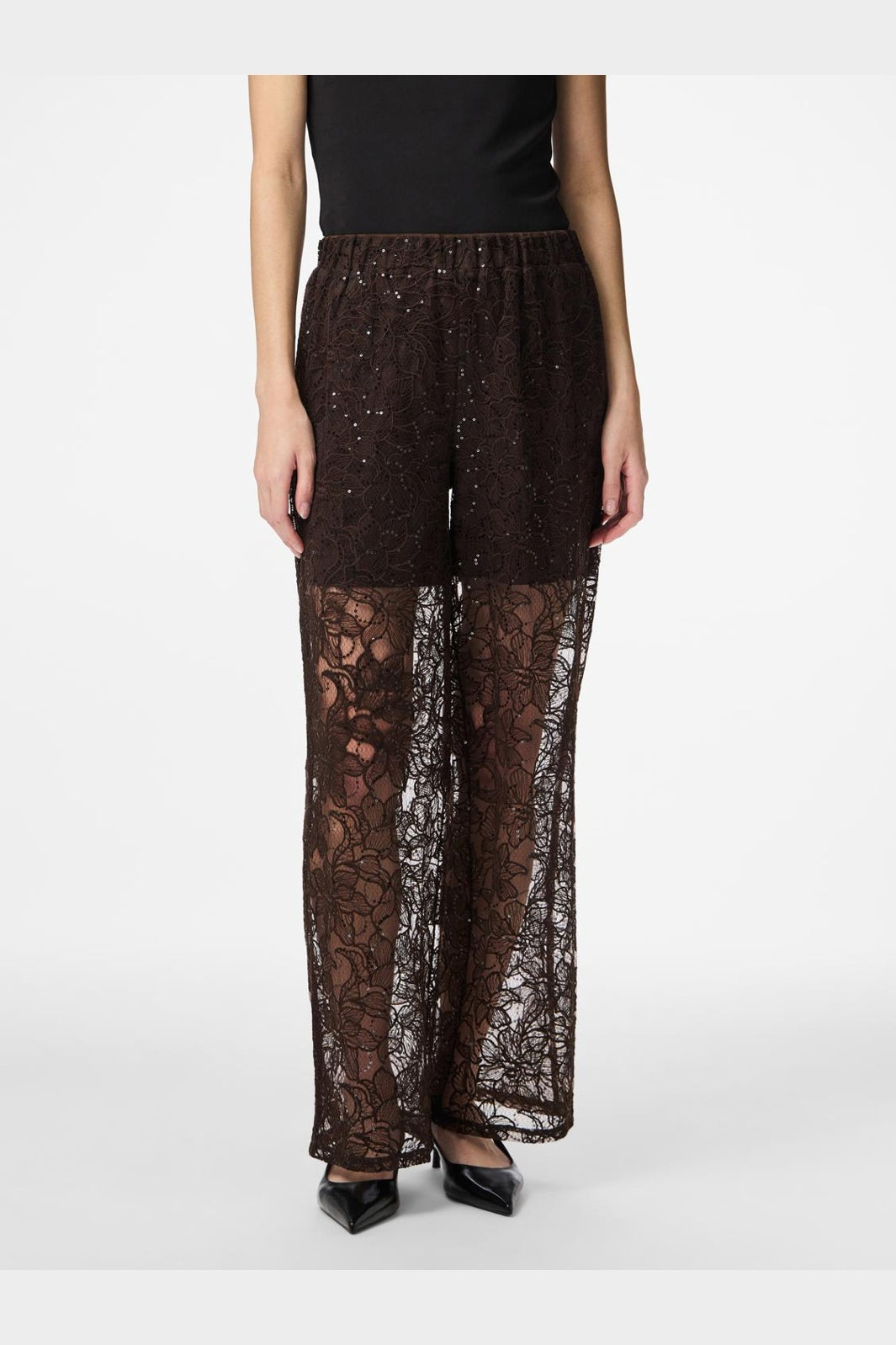 Gerade geschnittene Hose von Pieces, gefertigt aus transparenter Spitze mit Blumenmuster und Pailletten in einem dunklen Braunton.