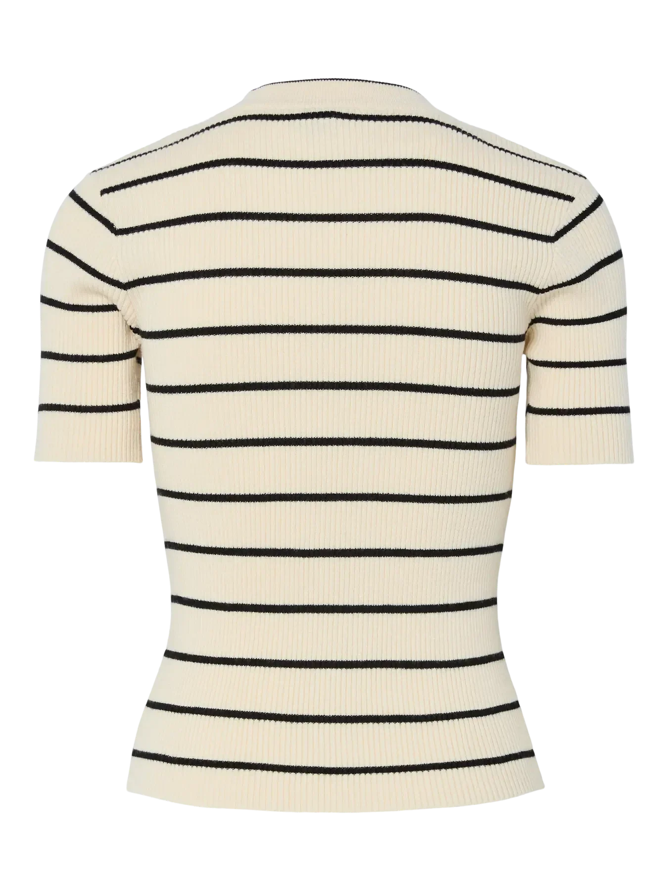 Gestricktes Top von Pieces mit schmalen Streifen in Off-White und Schwarz. Das Top hat einen Rundhalsausschnitt und kurze Ärmel mit einer figurbetonten Passform.