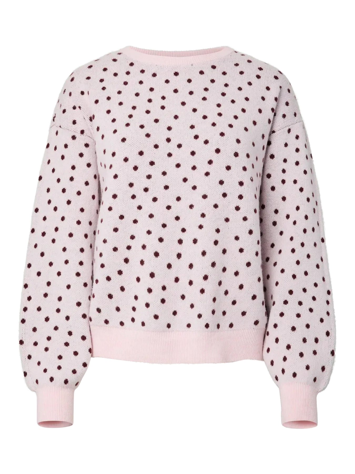 Strickpullover von Pieces in Rosa mit dunkelroten Punkten. Der Pullover hat einen Rundhalsausschnitt und Rippbündchen an den Handgelenken und am Saum.