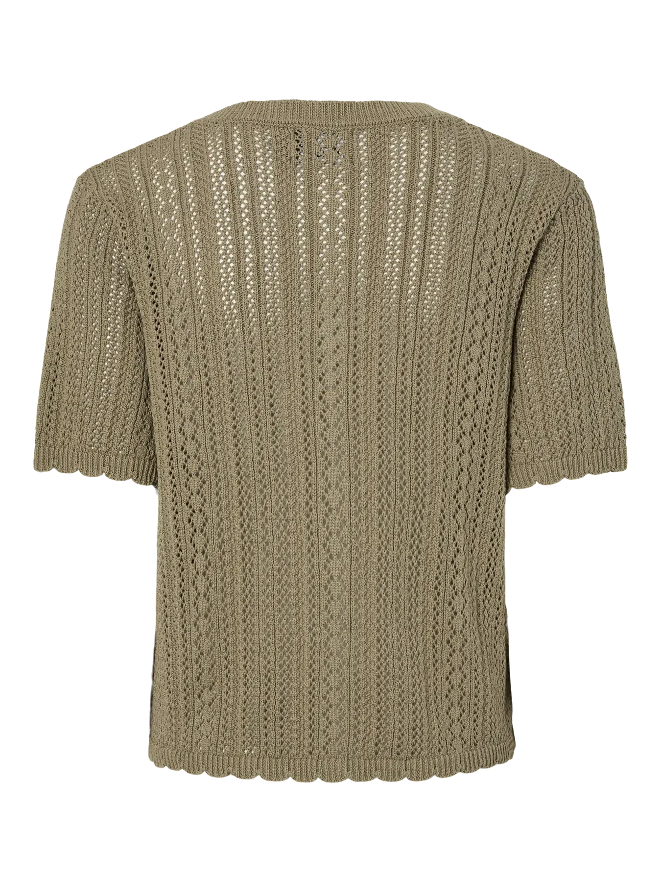 Gestrickte Strickjacke von Pieces in Khakigrün. Die Strickjacke hat kurze Ärmel und besteht aus 100 % recycelter Baumwolle mit dekorativen Nähten.