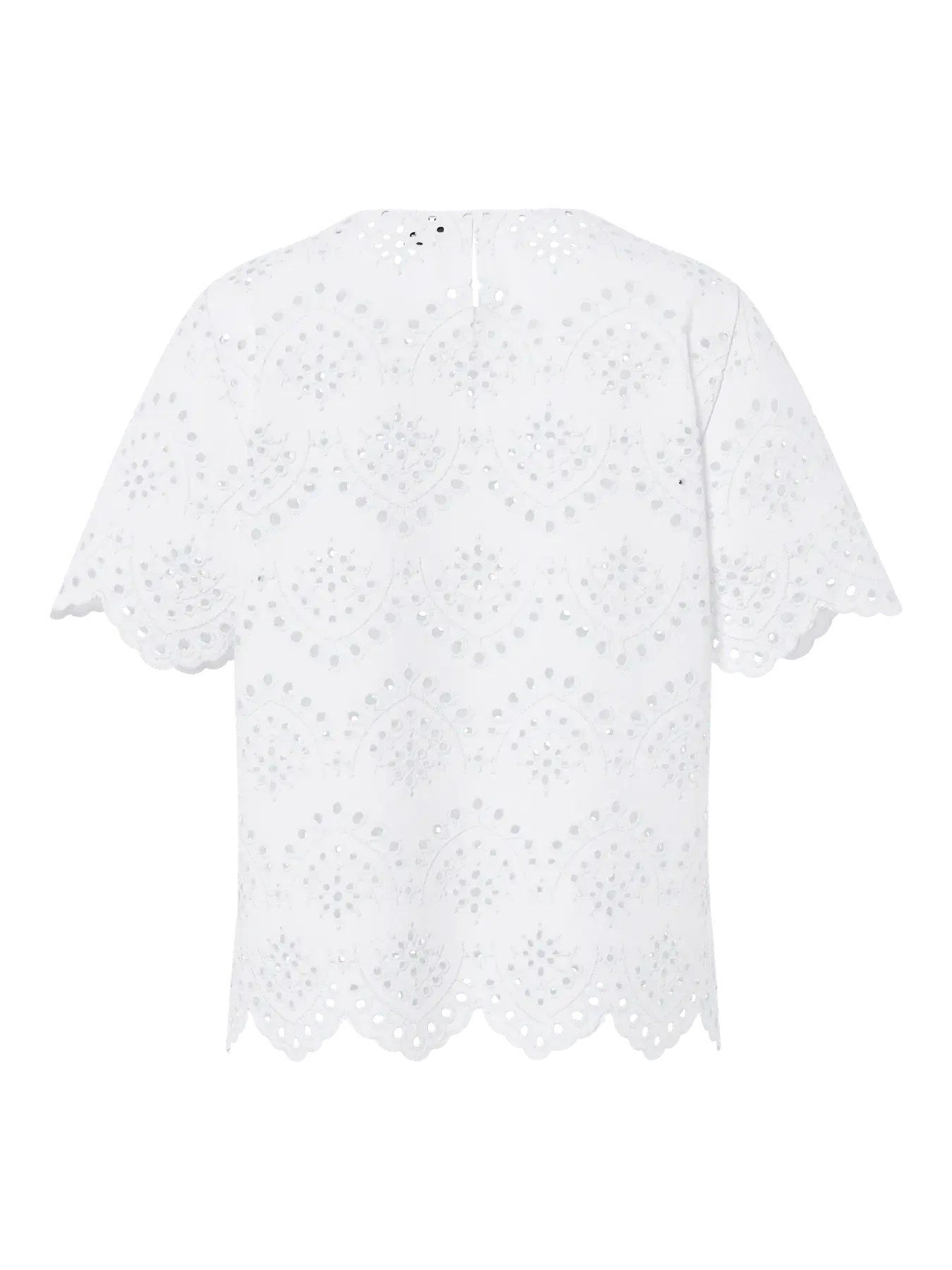 Weißes Top von Pieces, aus Baumwolle mit Stickerei und dekorativen Nähten. Das Top hat wellige Abschlüsse und einen runden Halsausschnitt.