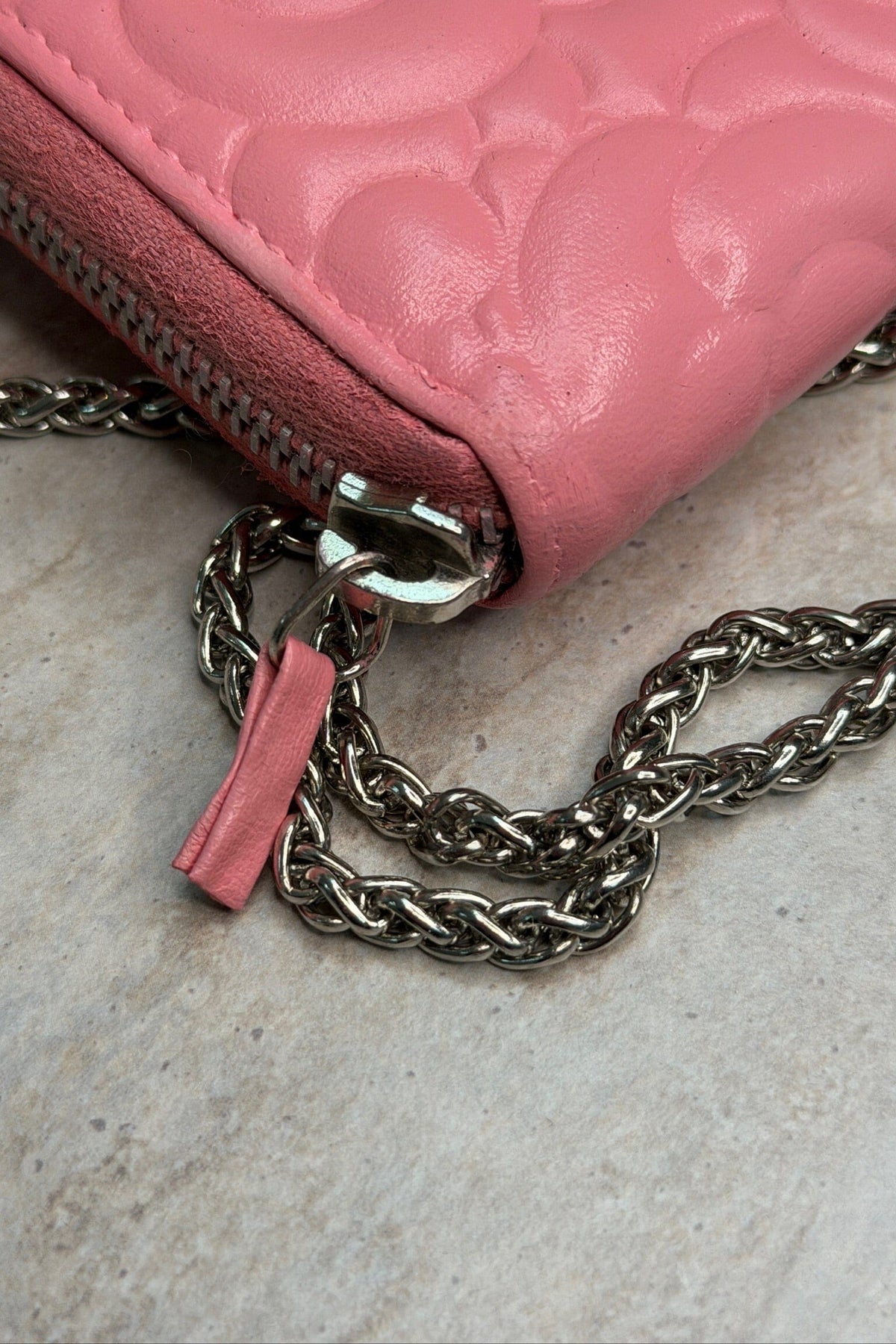 Rosa Geldbörse von Chanel mit Blumenmuster und Kettenriemen. Das Produkt stammt aus der Preloved Vintageline x Molly&My und ist in gutem, aber gebrauchten Zustand.