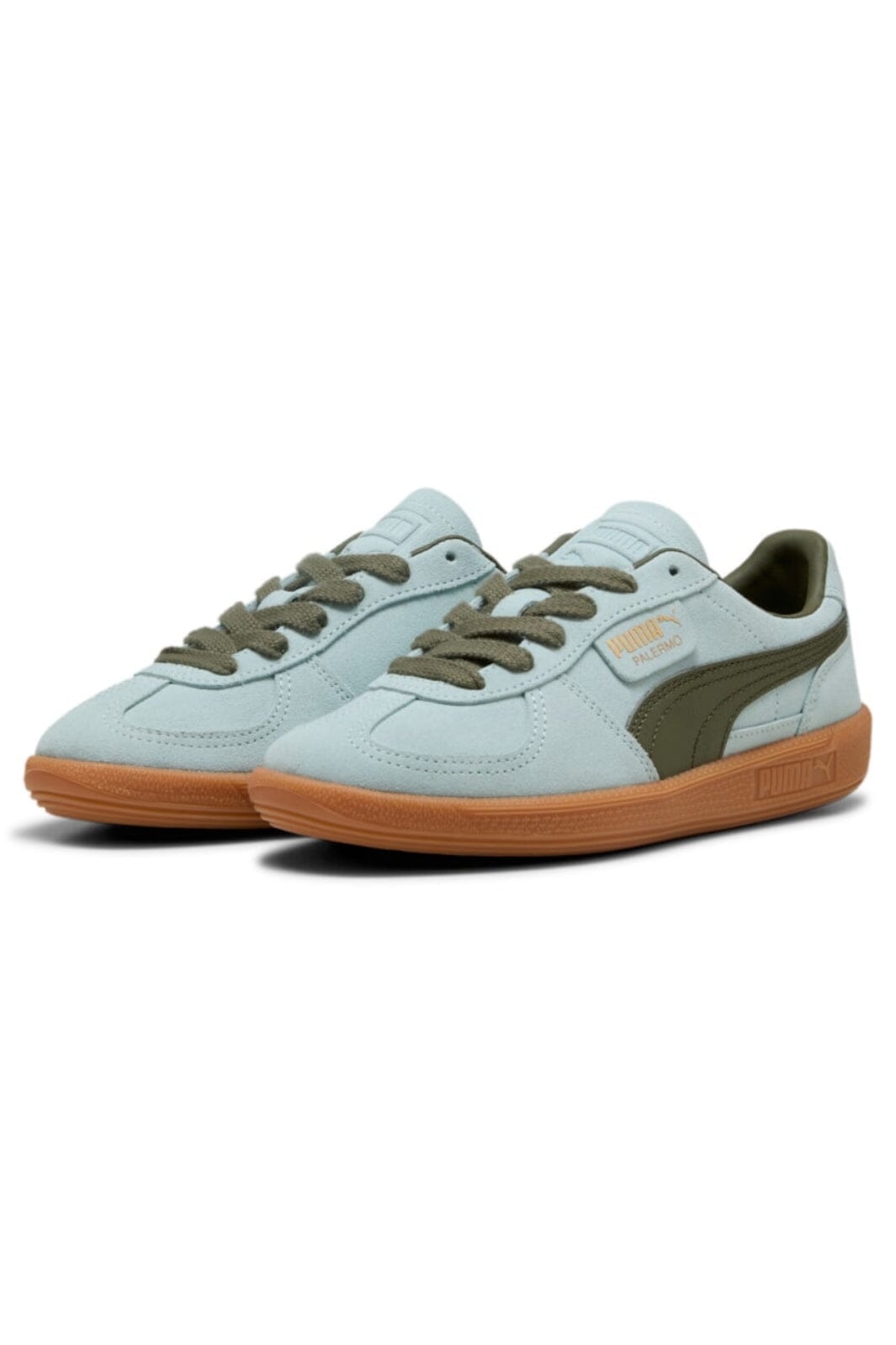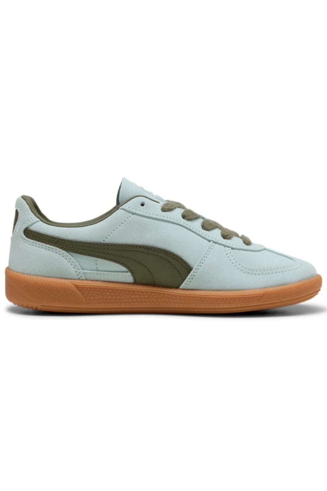 Himmelblaue Sneakers von Puma mit olivgrünen Details. Das Obermaterial besteht aus Leder mit einer robusten Gummisohle. Der Schuh hat ein retro-inspiriertes Design mit Schnürung.