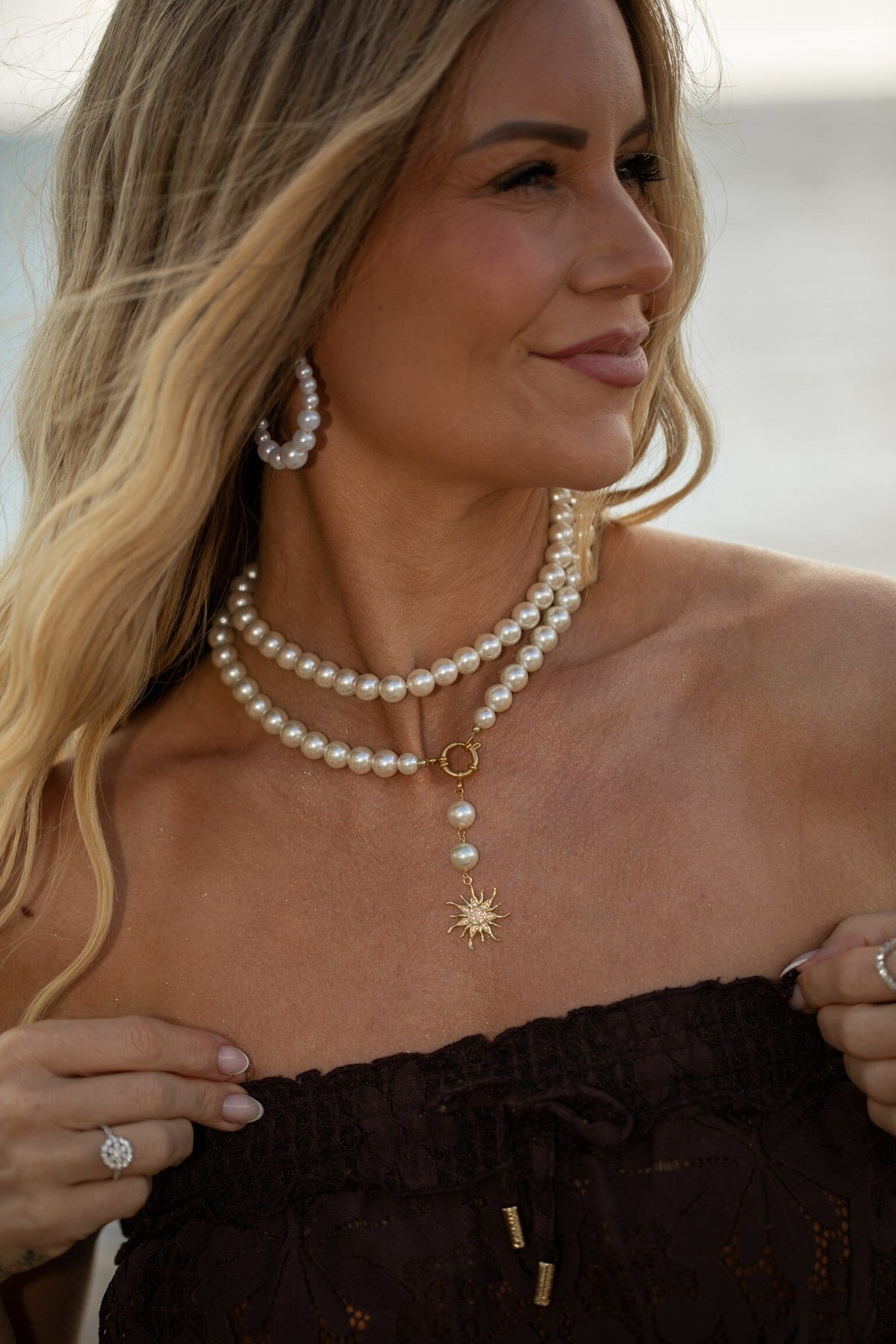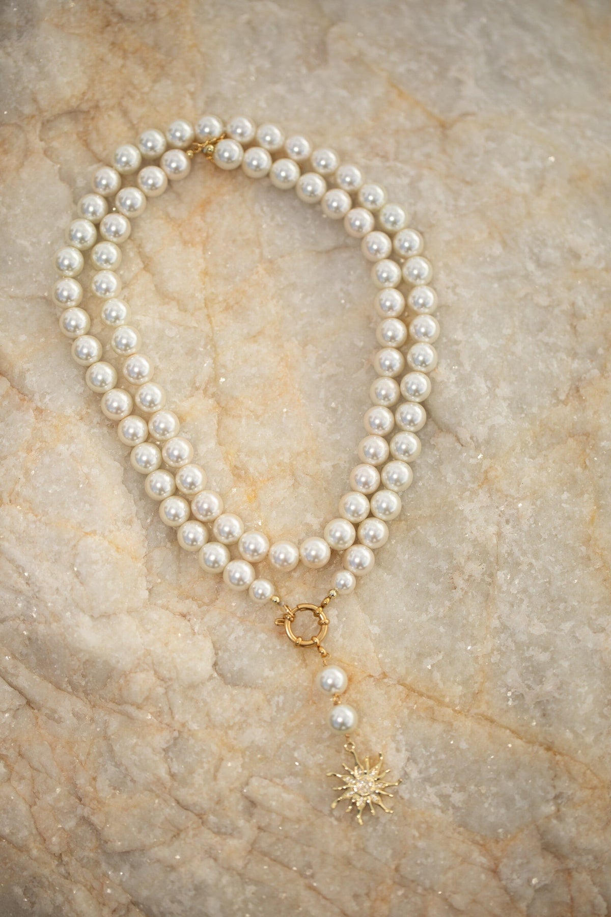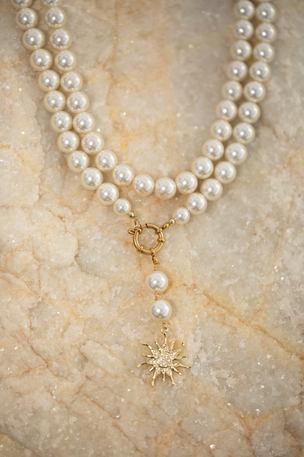 Choker-Halskette von Rooted mit zwei Reihen aus Perlen und Muscheln sowie einem sonnenförmigen Anhänger. Die Halskette ist vergoldet und hat einen goldfarbenen Verschluss.