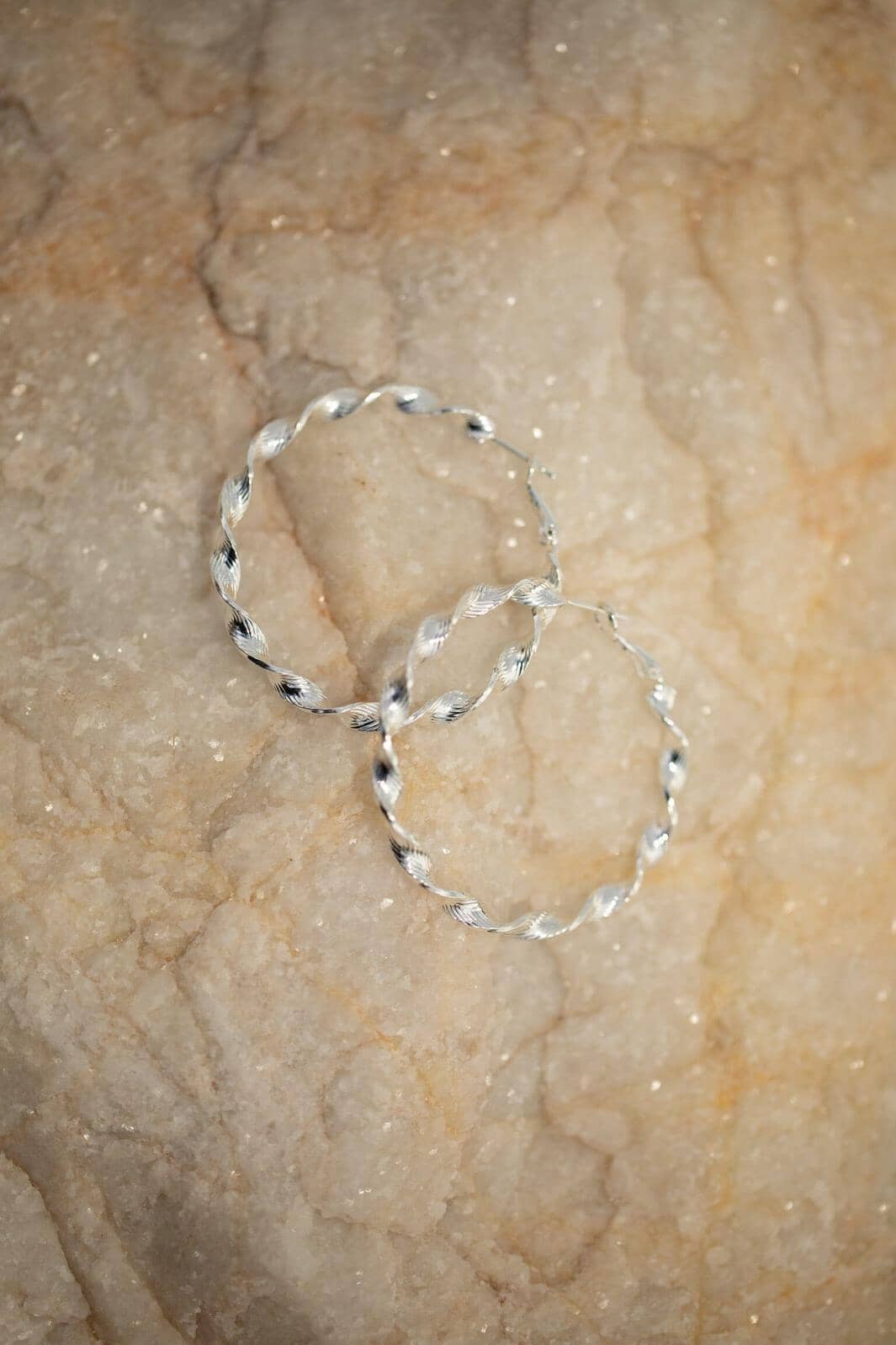 Große Ohrringe von Rooted mit einem gedrehten Design. Die Ohrringe sind versilbert und haben eine glänzende Oberfläche.