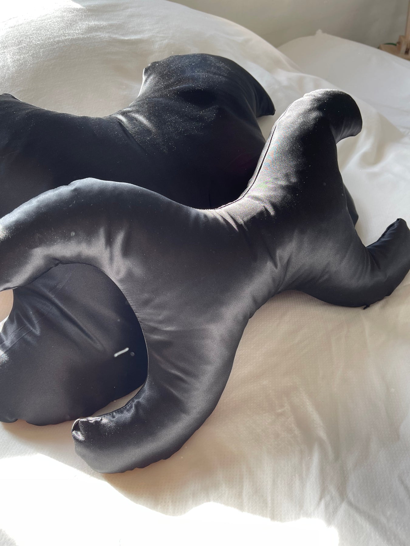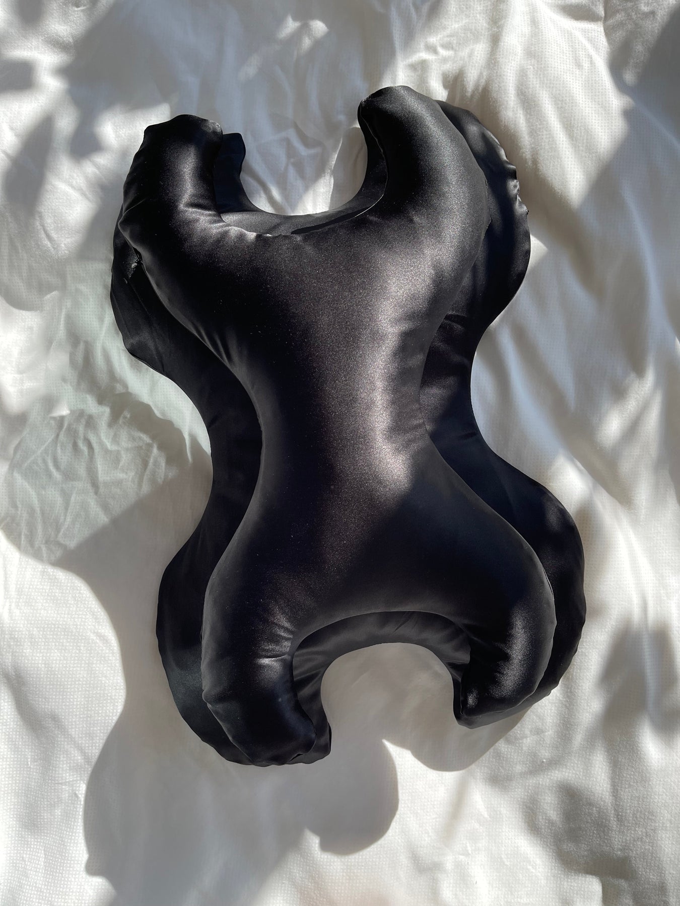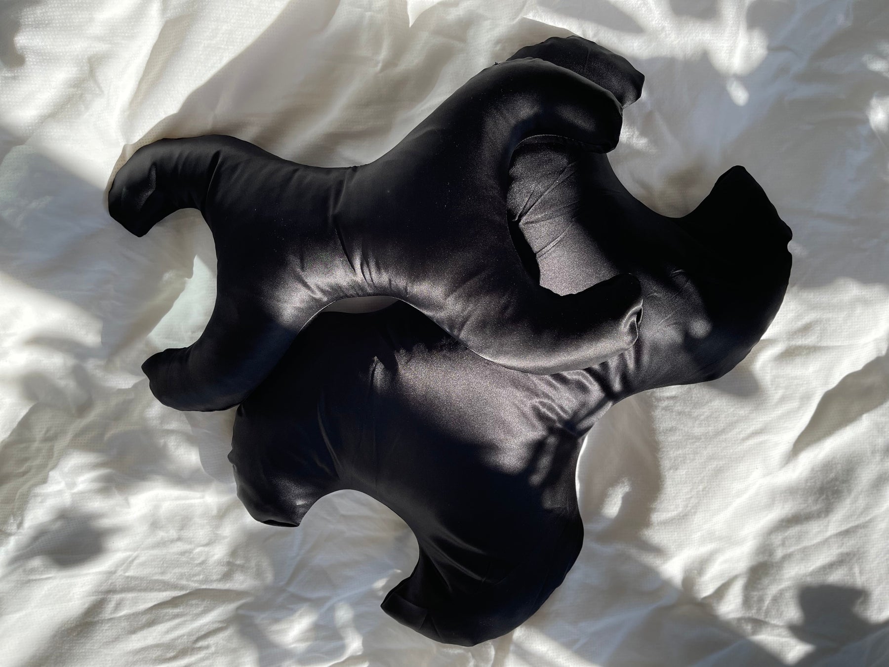 Schwarz Seidenbezug von Save My Face für das La Petite-Kissen. Der Bezug besteht aus Charmeuse-Seide mit antiseptischen Eigenschaften, die nachts vor Hautirritationen schützen.