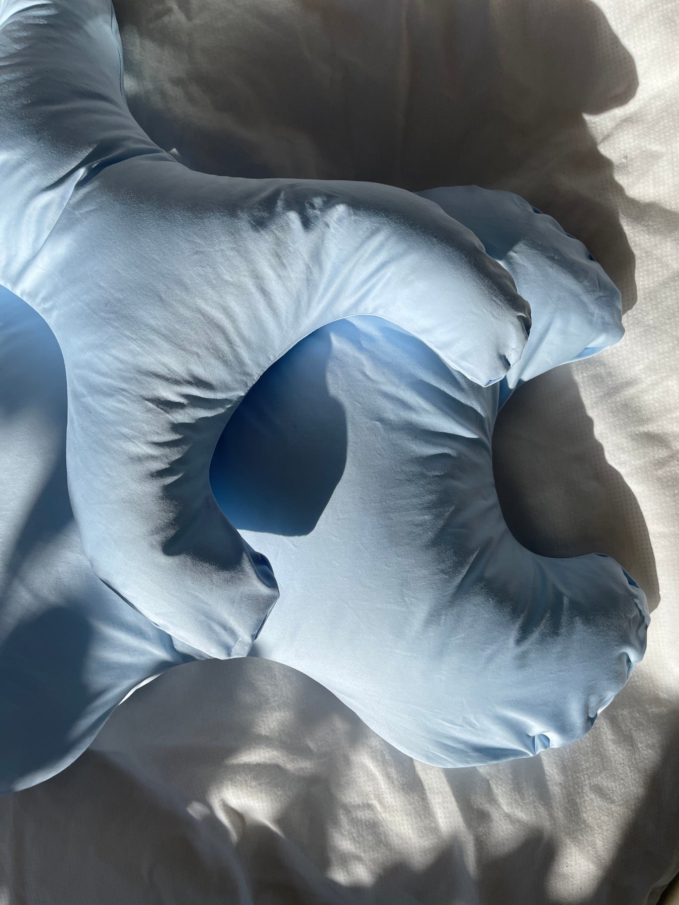Kleine Kissen mit X-förmigem Design und hellblauer Hülle aus 100 % Baumwolle. Das Kissen ist mit synthetischen Fasern gefüllt, die sowohl bakterienresistent als auch feuchtigkeitsabweisend sind.