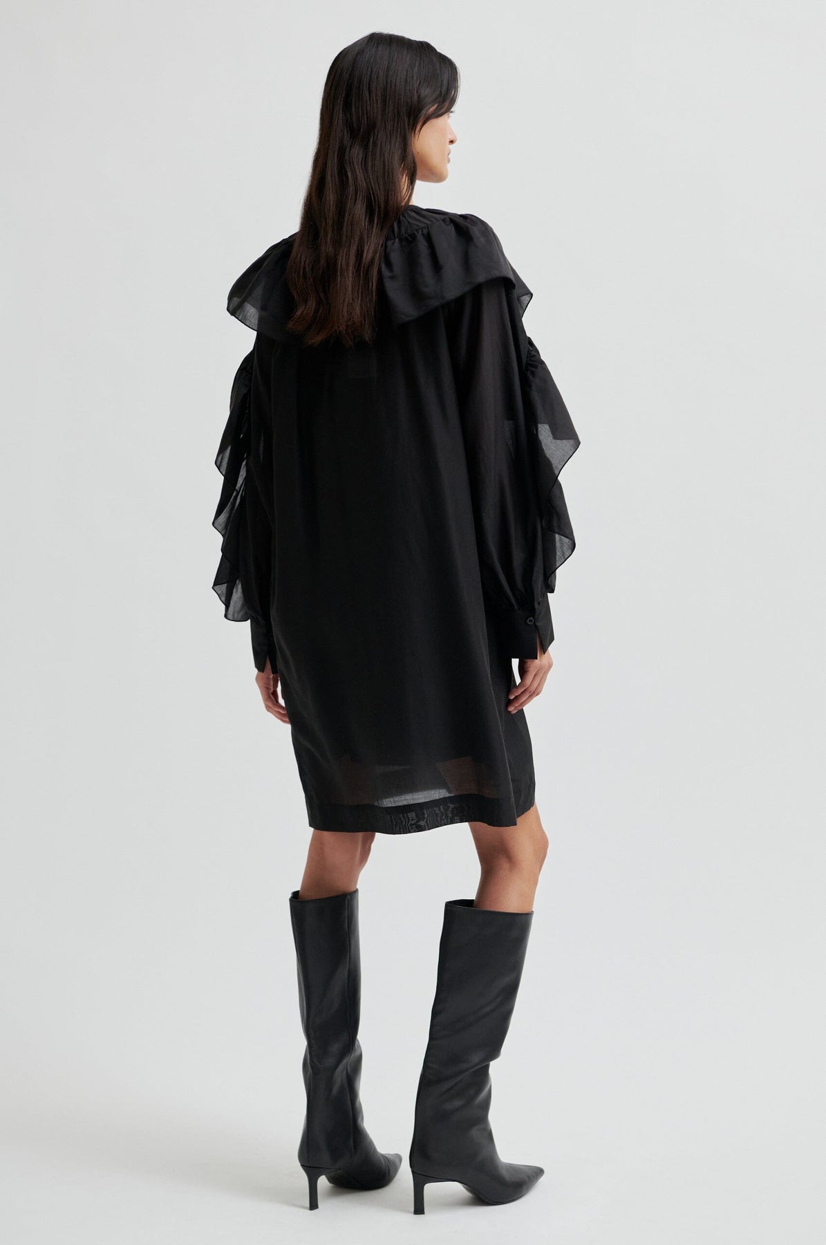 Schwarzes Kleid von Second Female mit diagonalen Rüschen-Details am Halsausschnitt und an den Ärmeln. Das Kleid hat eine lockere Passform und besteht aus einem leichten, semitransparenten Material.