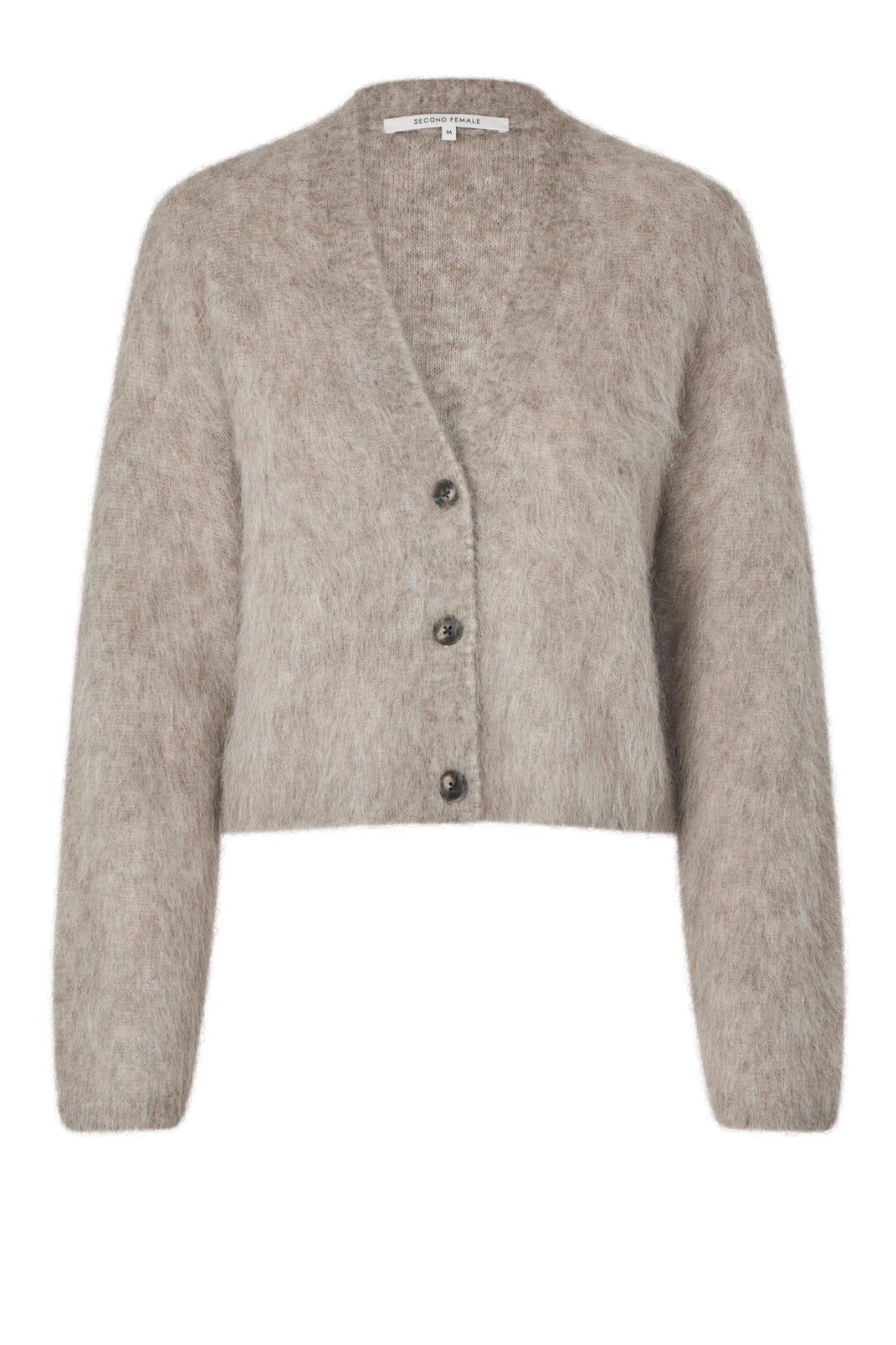Eine gestrickte Strickjacke von Second Female in einem hellbraunen Farbton. Die Strickjacke hat eine weiche, flauschige Textur und eine entspannte Passform.