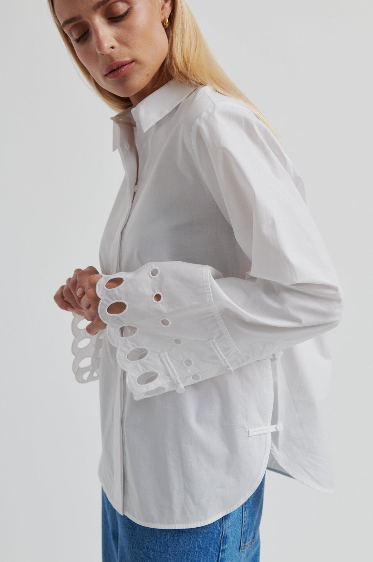 Weiße Bluse von Second Female aus 100 % Baumwolle. Die Bluse hat einen klassischen Kragen, eine durchgehende Knopfleiste und 3/4-Ärmel mit dekorativen Ausschnitten an den Manschetten.