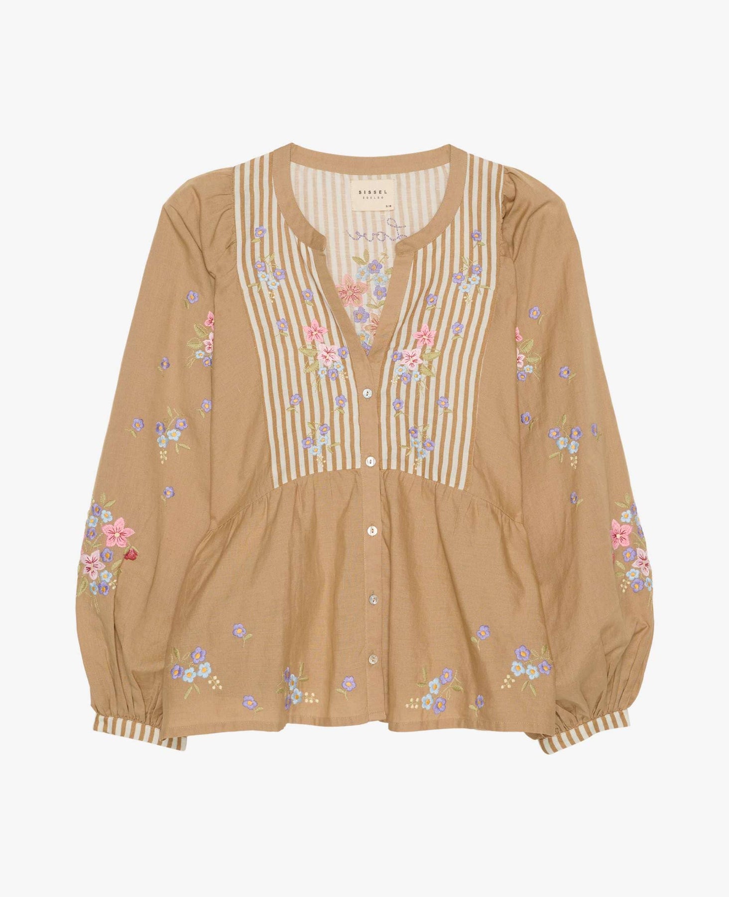 Ein Top von Sissel Edelbo in einem hellen haselnussbraunen Farbton. Der Top hat bestickte Blumen, gestreifte Details und Perlmuttknöpfe.