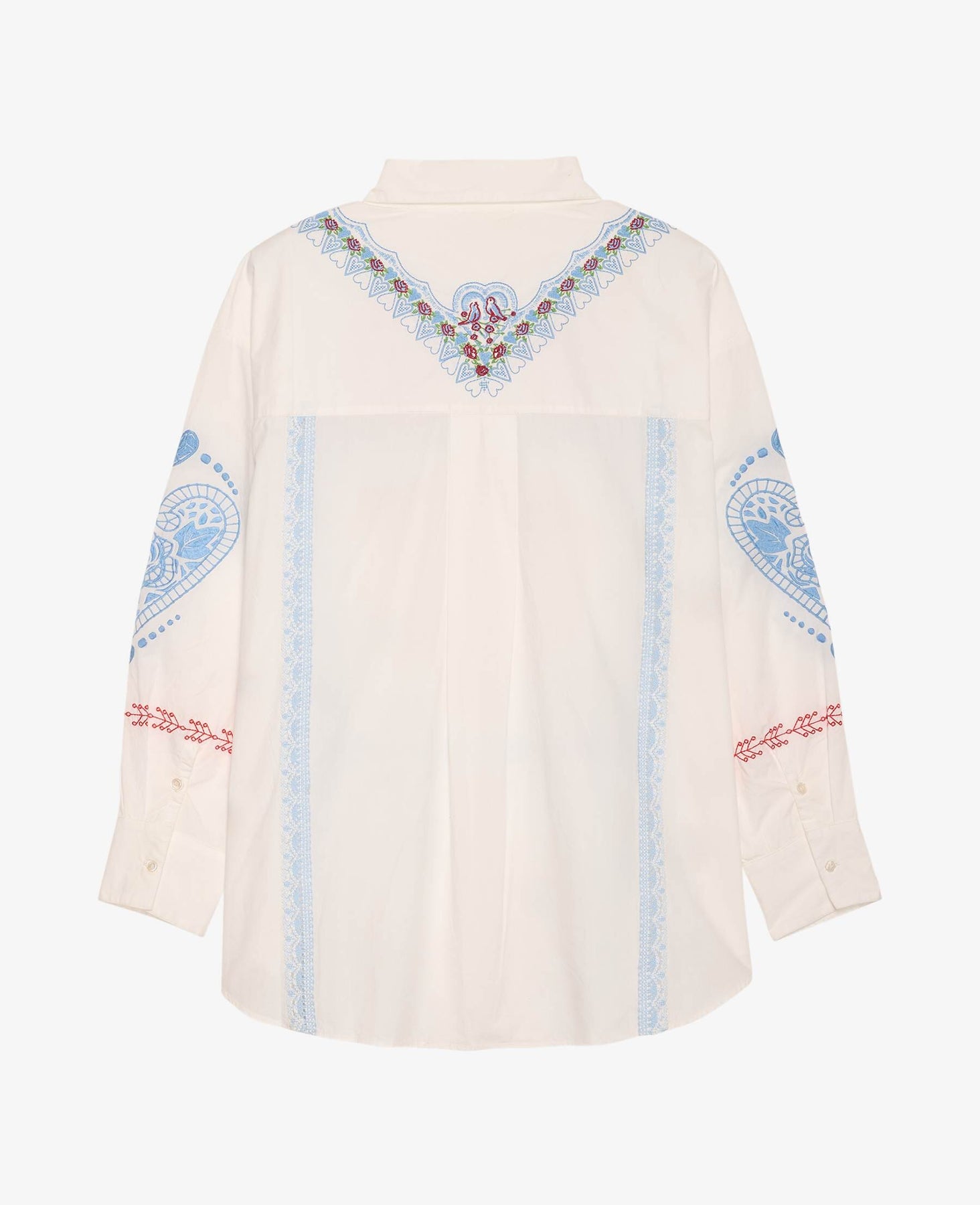 Weiße Bluse von Sissel Edelbo mit gestickten Blumen und Herzen in rosa und blauen Nuancen sowie feiner Spitze entlang der Ärmel.