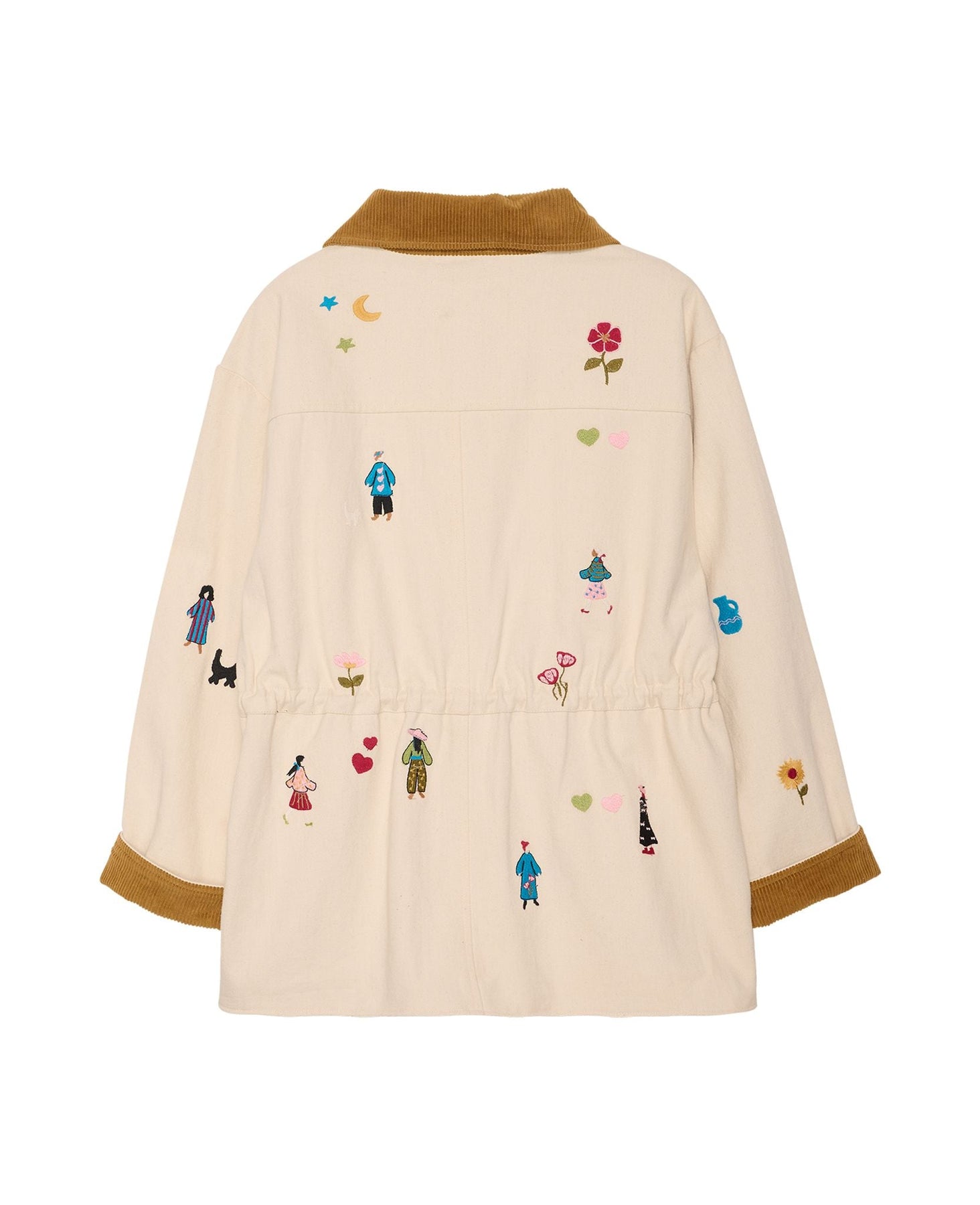 Weiße Jacke von Sissel Edelbo mit bestickten Motiven von Figuren, Blumen und Herzen. Die Jacke hat einen braunen Kragen als Kontrast zum Rest.