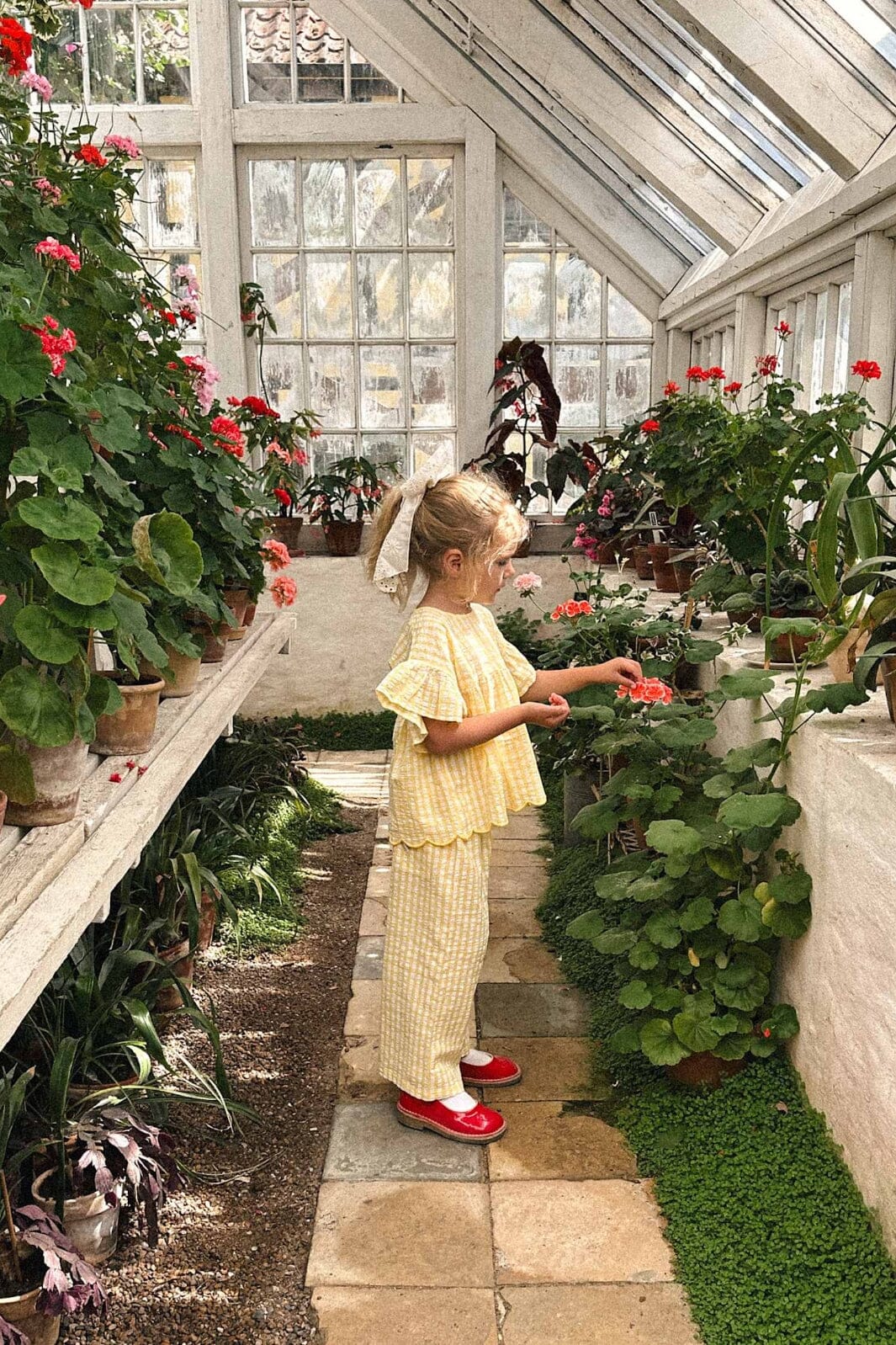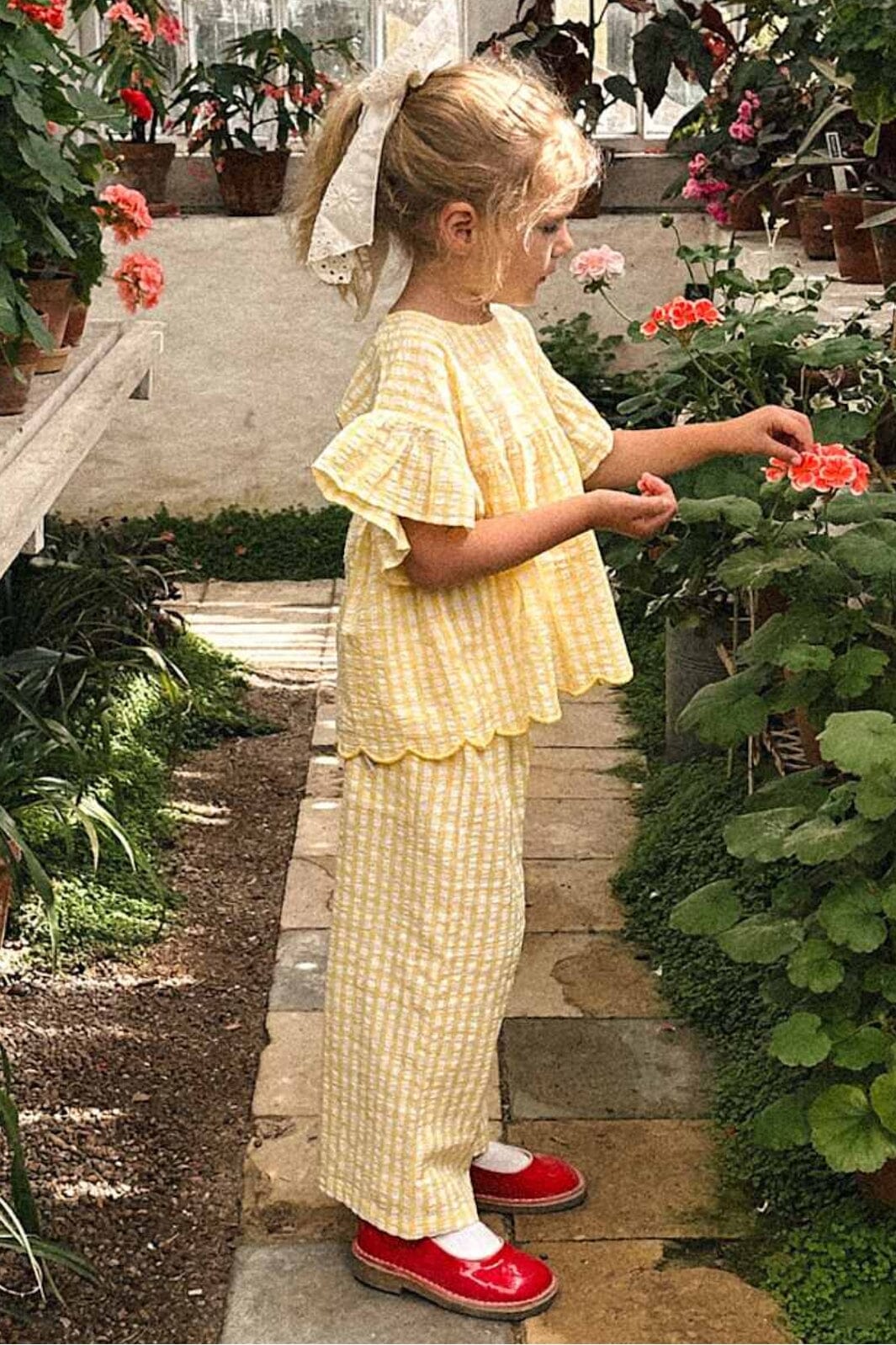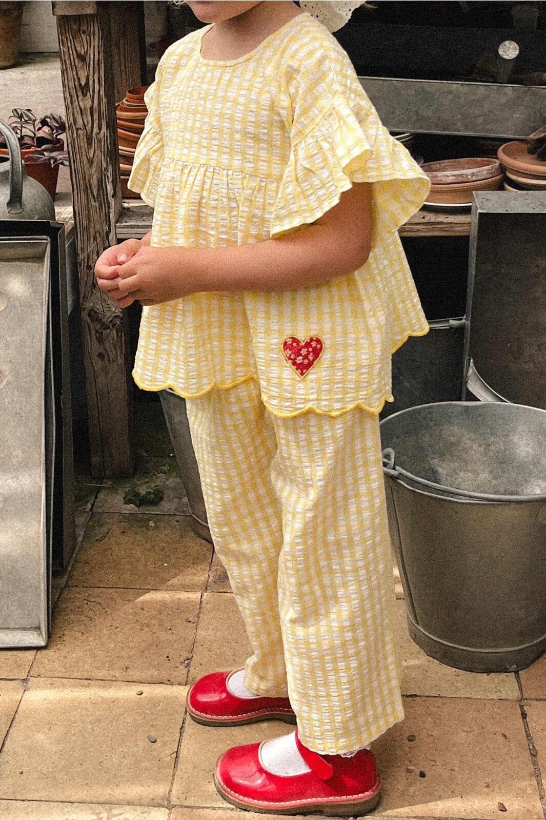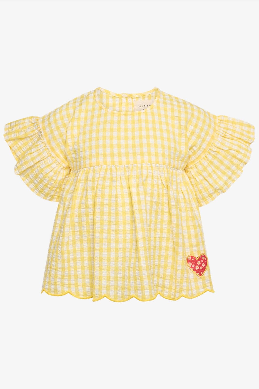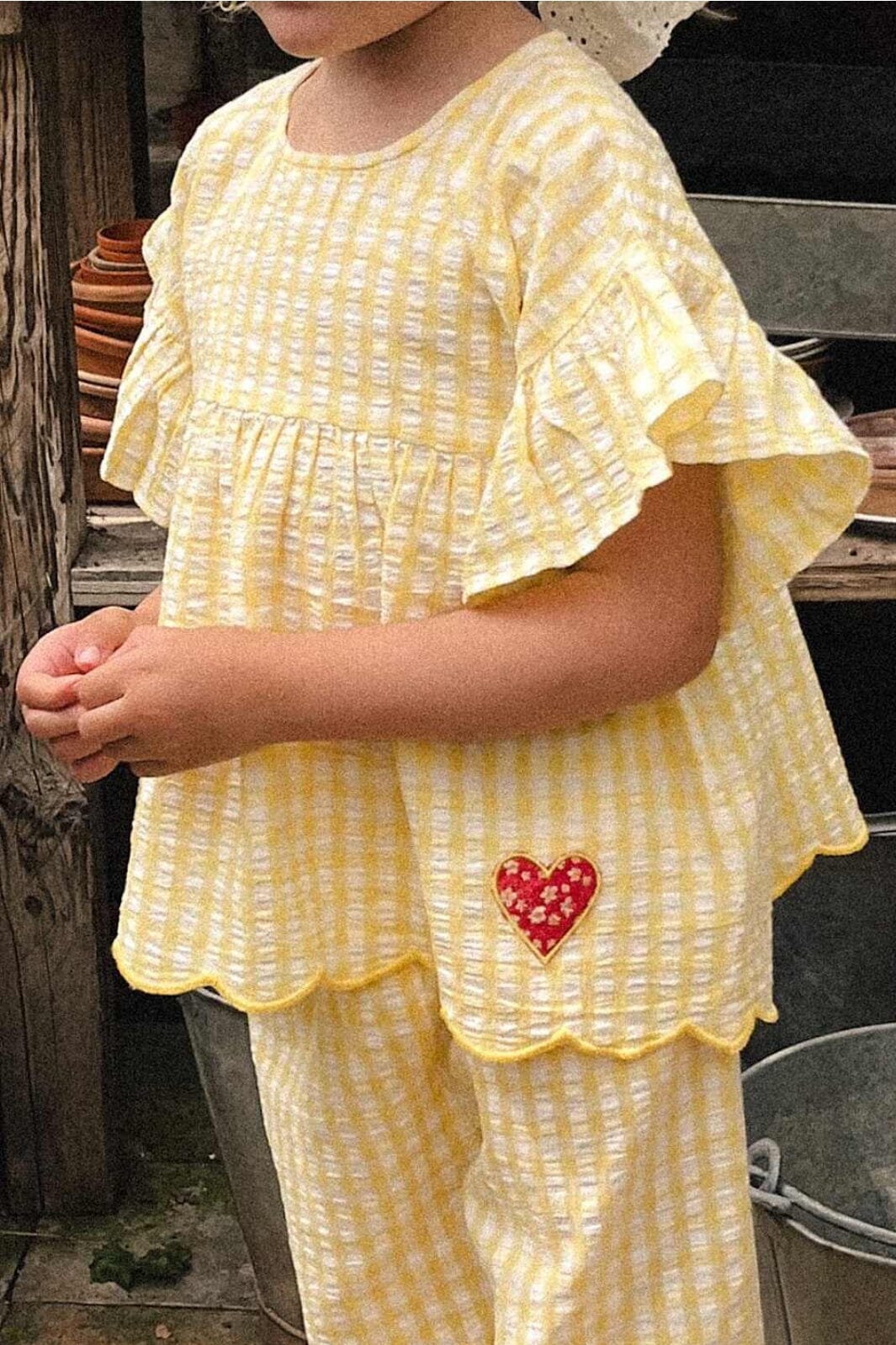 Gelbes kariertes Top von Sissel Edelbo aus Bio-Baumwolle. Das Top hat Volantärmel und gewellte Kante unten sowie ein rotes blumiges Herz auf der Vorderseite.